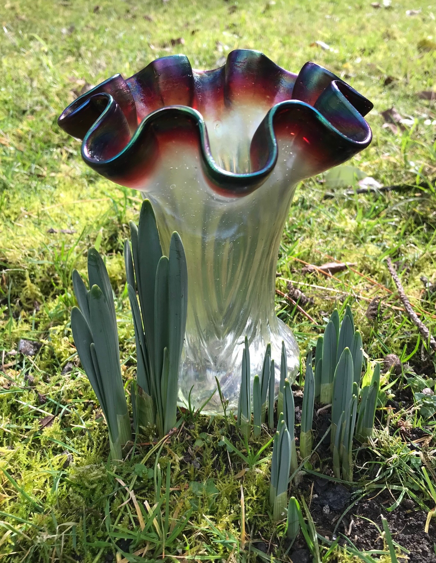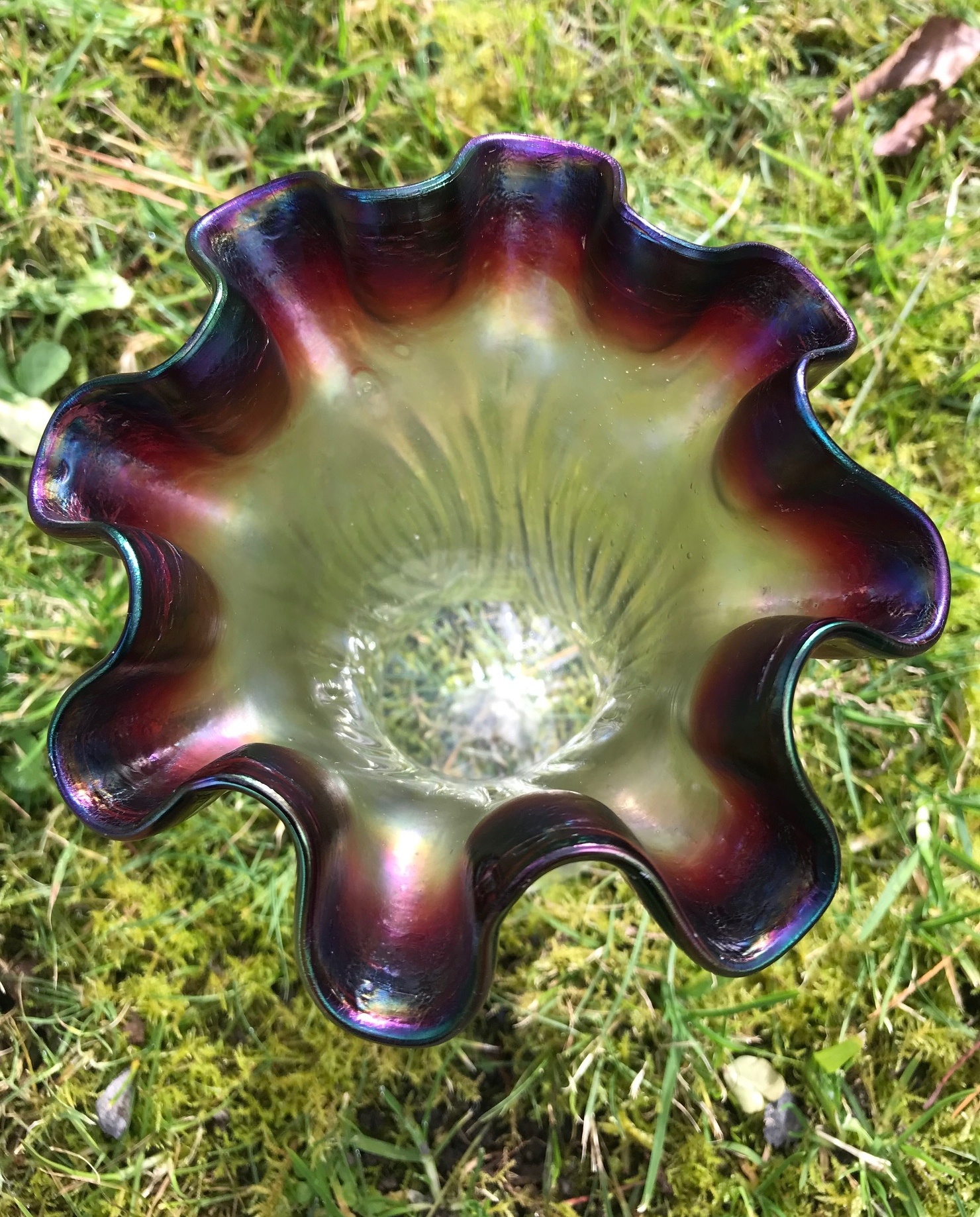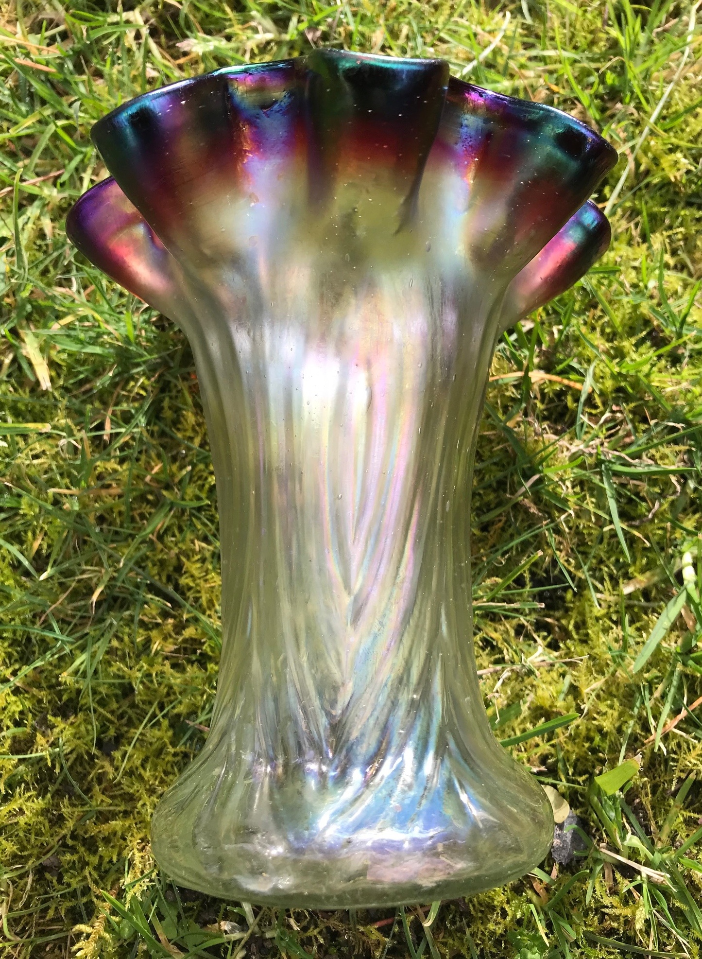 The vase is made from clear glass that shades to deep red at the crimped top rim. There is a wave type raised pattern & an iridescent finish. The vase measures 15 cm tall, 12.5 cm across the top rim & 9 cm across the base, which has a rough pontil mark.