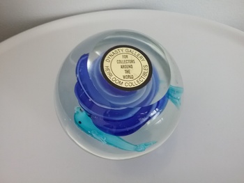 Here is a 3 1-2" round clear glass paperweight with two small blue dolphins skimming the swirling cobalt blue & white ocean waves. From Dynasty Gallery Glass Heirloom Collectibles line, orig gold & black label on the bottom