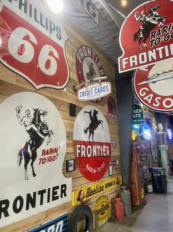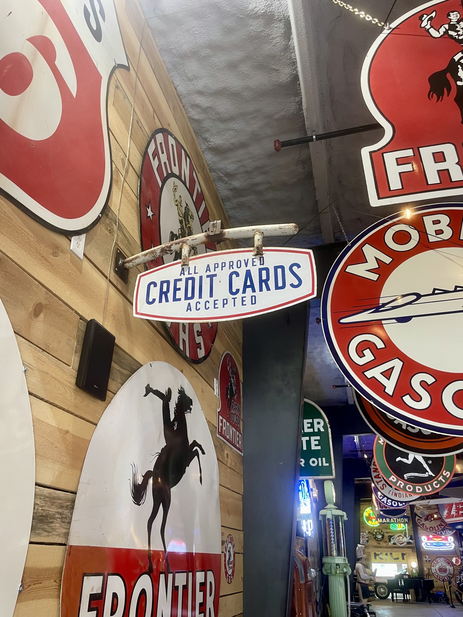 We got this Credit Card sign several years ago and it has sat in storage ever since. Until this week, that is! I finally picked and empty spot by the Frontier signs and think it fits pretty good with them. Back in the 50s I never had a credit card and always paid cash for gas, but gas was only .25/gal so it was common to buy $1 worth and get my windows washed and tire pressure checked. Good ol days with full service stations everywhere.