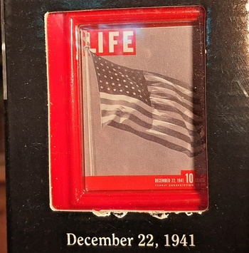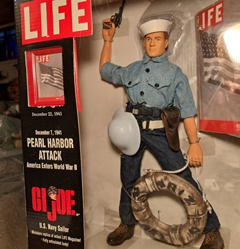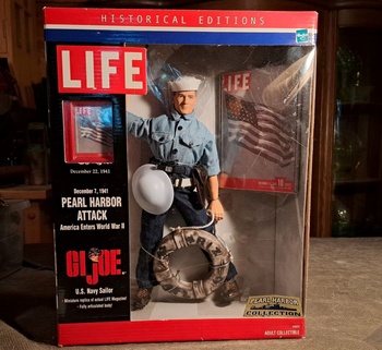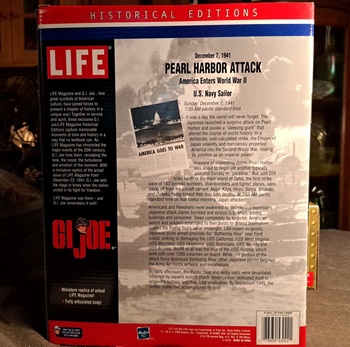 I usually take these later figures out of the box but I think I will leave this one in the box. It is a well-made display. It depicts an early WWII US sailor with the WWI style helmet. Apparently, he is attempting to take on airplanes with a revolver. He is also holding a blackened life ring from the Arizona. Finally there is a miniature replica of the December 22 1941 edition of Life Magazine.