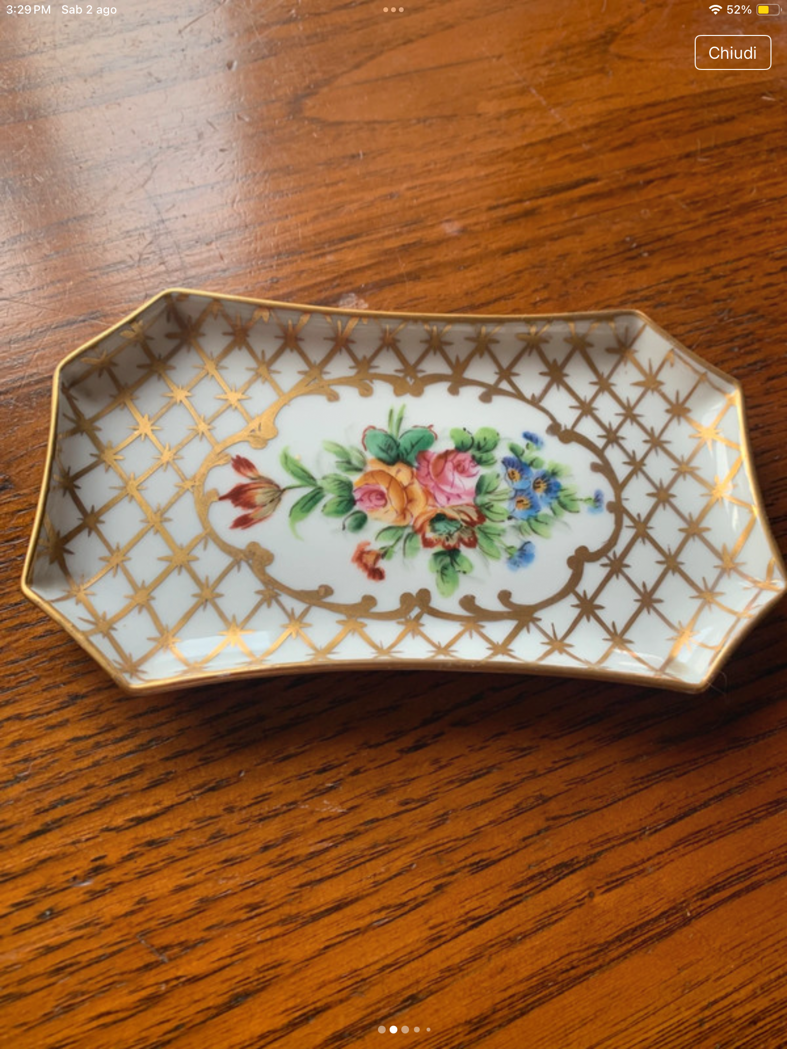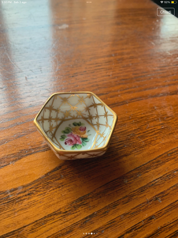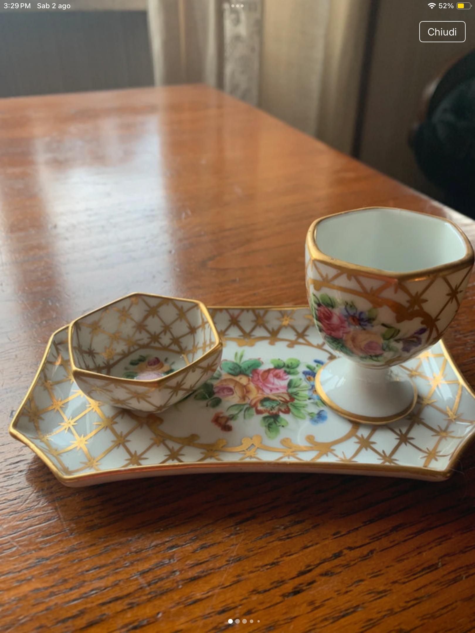 I’m looking for help identifying this porcelain set I recently found. It consists of a small rectangular tray, a tiny cup (possibly an egg cup or decorative chalice), and a small hexagonal container — all decorated with floral motifs and gold filigree.