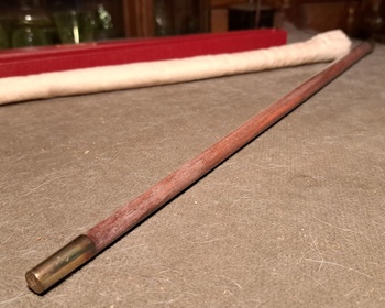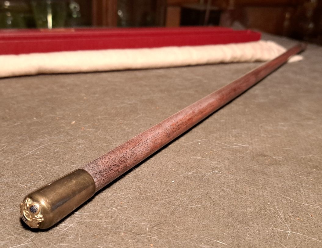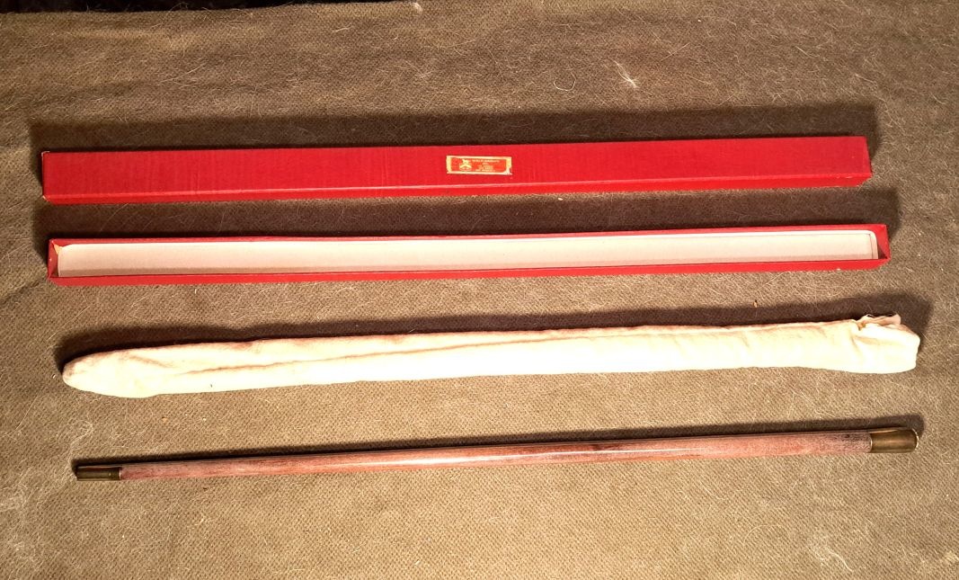 This exciting swagger stick came with the box and a clothe bag and is in near mint condition. It is about 21" long capped with metal of some sort at each end. The thick end has a US emblem with a shield/flag. It is a bit difficult to see what it is exactly. But apparently it is for American officers. These are usually seen with British officers but apparently were used by the US too.