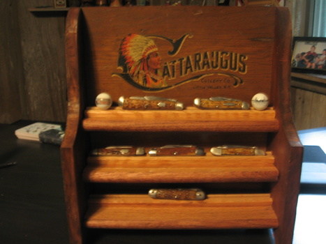 Just made this today, the back board is from a Cattaraugus knife box, it was already cut down to that size by someone. It is probably a rare piece. The knives are the only Cattaraugus knives that I have been able to afford--hope to find more in the future! Thanks for lookin!! Rob