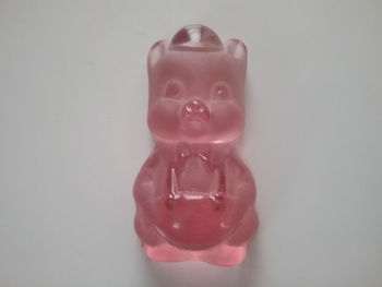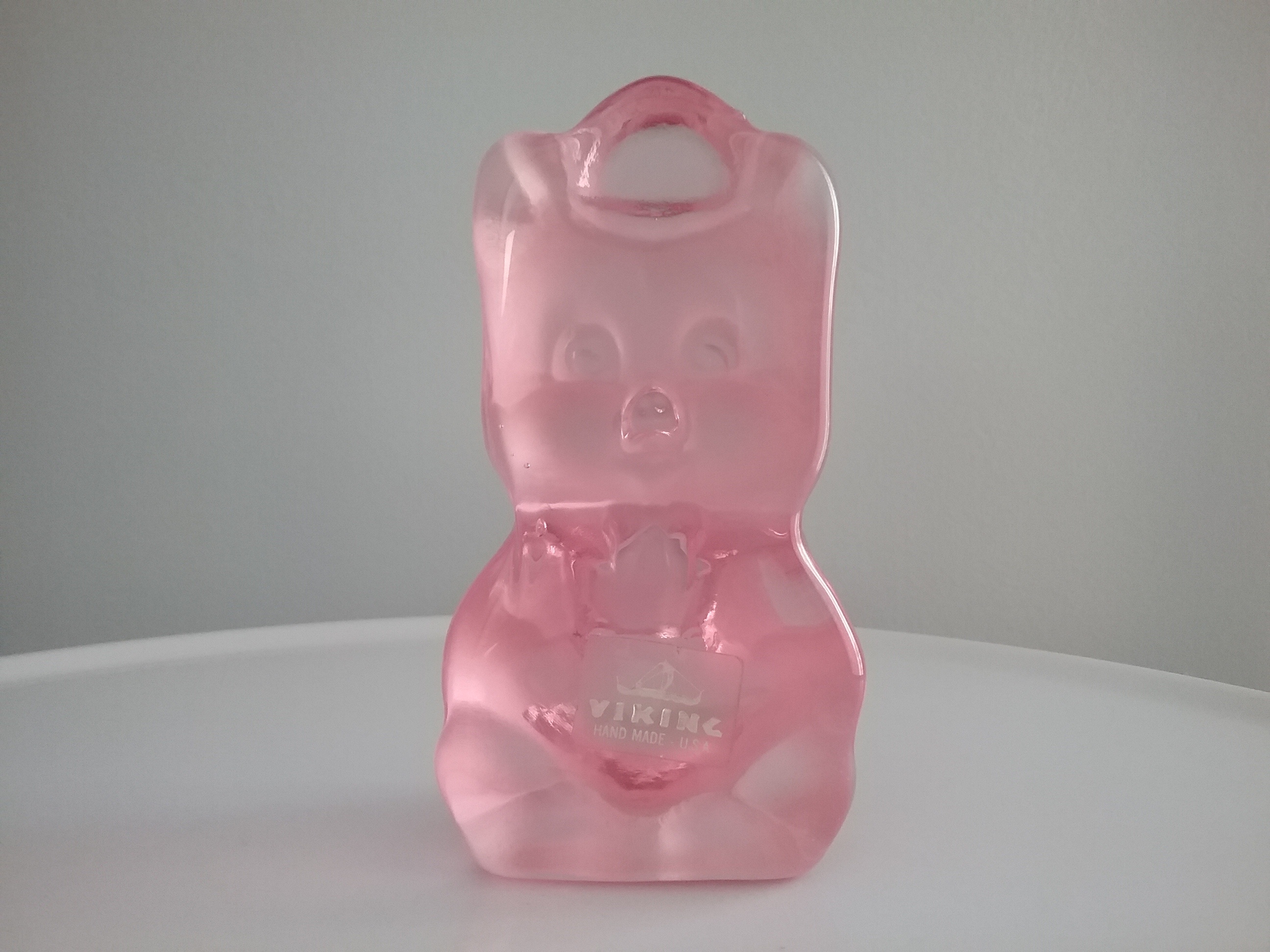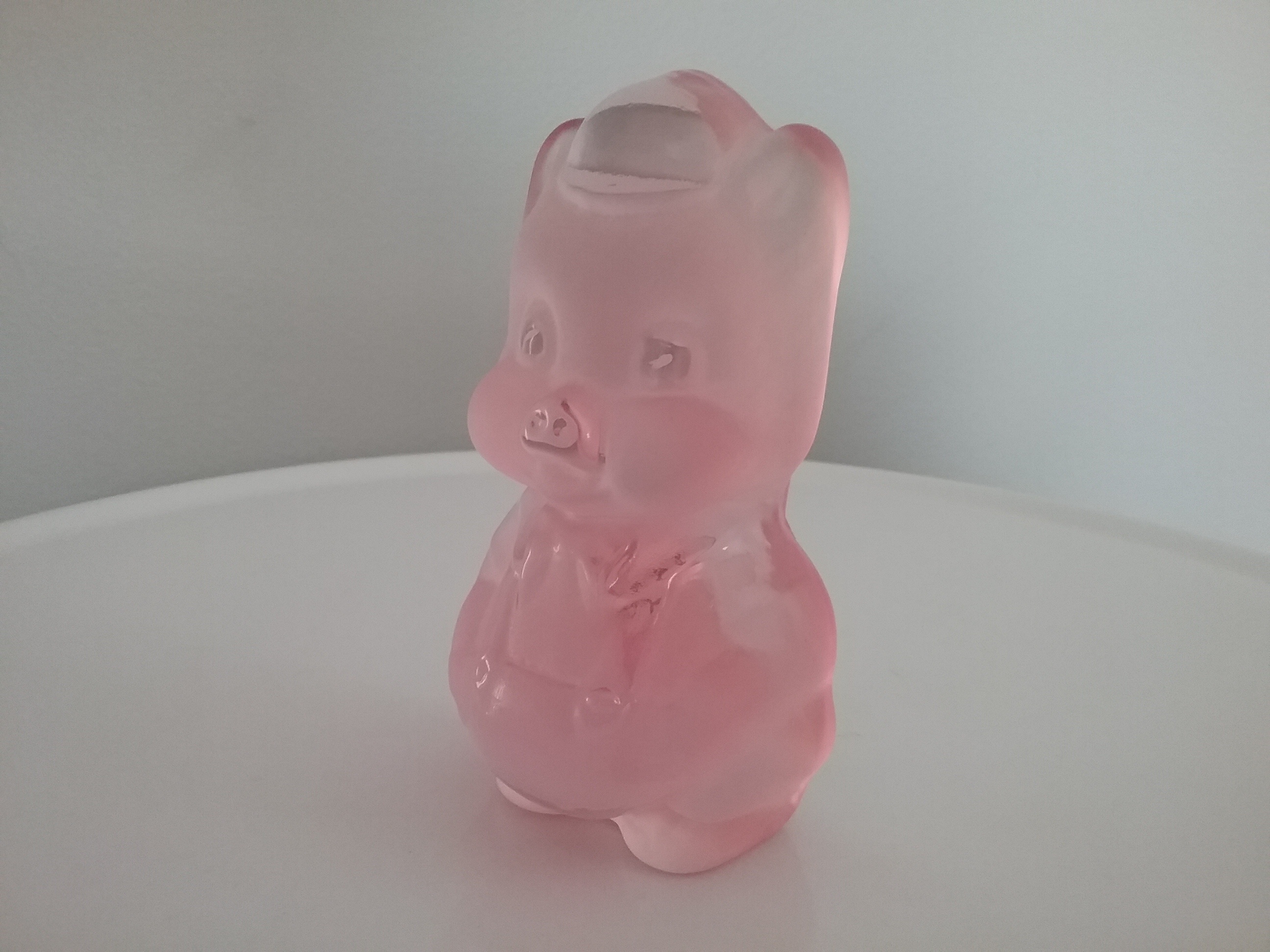 Here is a 4 1-2"H pink clear & frosted glass paperweight of beloved cartoon character Porky Pig wearing hat and suspenders. Made by Viking Glass with orig clear/gold label ca the 1980s