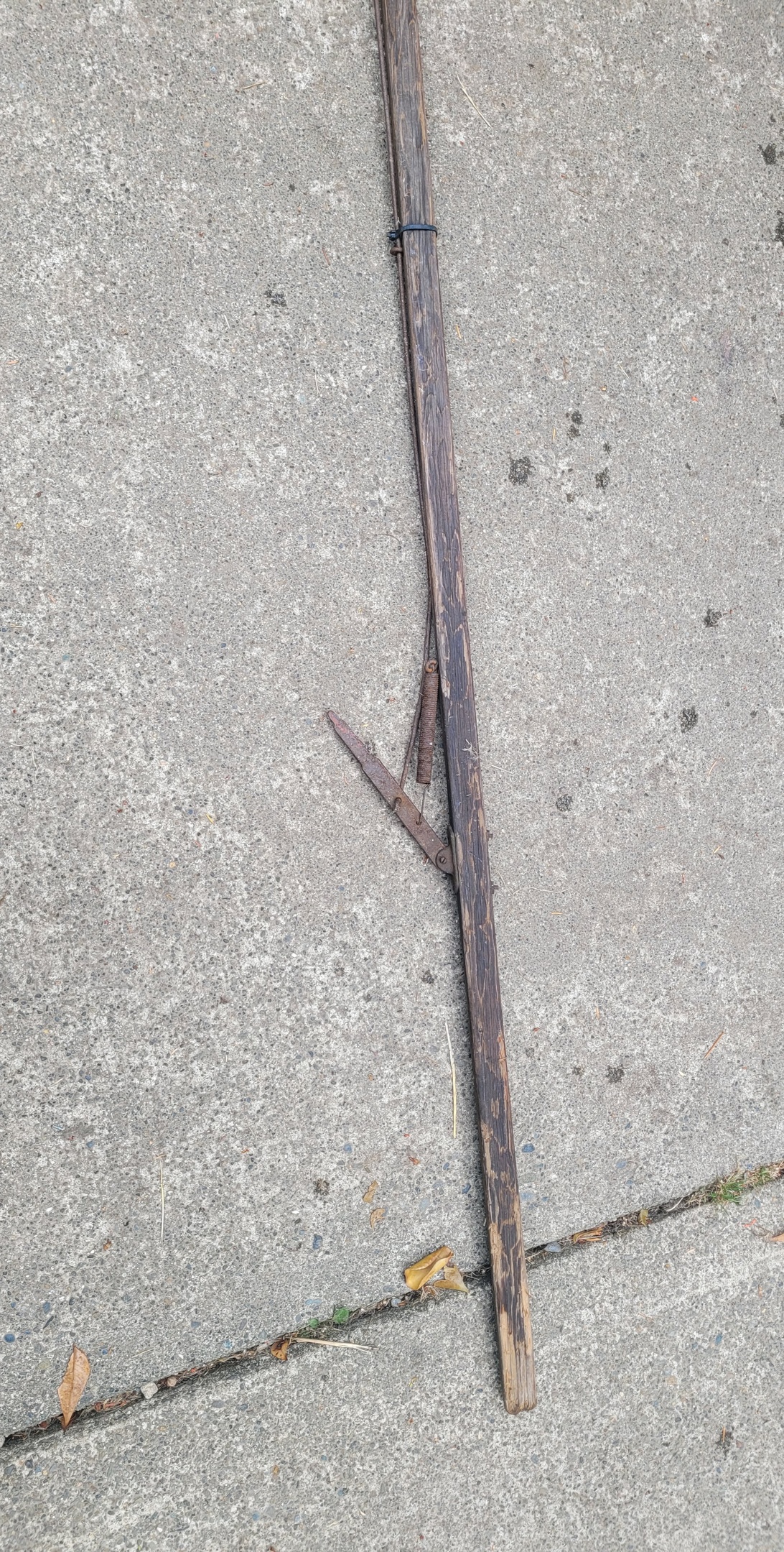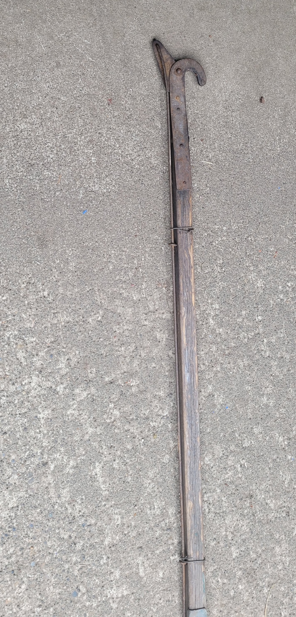 To me it looks like a tree pruner and i have a modern version.. But my brother in law grew up in Oregon and says they used a similar tool with a basket below to harvest fruit. I have seen the other style harvest tools. It's going to be a garage hanger.