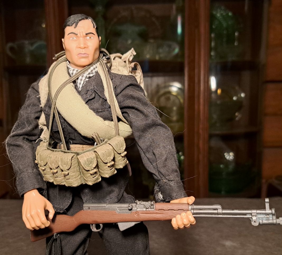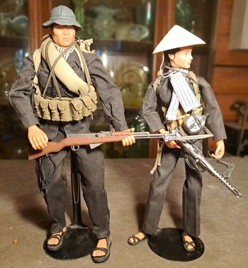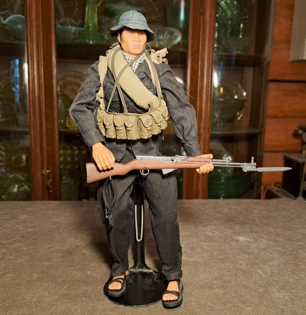 The male counterpart of the figure I posted earlier. Although this one is from 21st Century Toys/Ultimate Soldier. as Opposed to Dragon. I think this one has a few more accessories and a rather large backpack. Not sure that would fit in a tunnel. The Vietcong (VC) were irregulars /militia/guerrilla fighters and referred to as Charlie (who does not surf). The North Vietnamese Army or NVA was called Charles .Anyway this guy is armed with an SKS a weapon that preceded the AK47. It uses the same ammo as the AK but only holds 10 rounds. The SKS was prized by US servicemen as the semi-automatic and they could send them home. In addition he also 2 grenades.