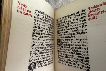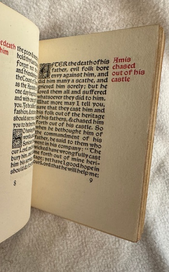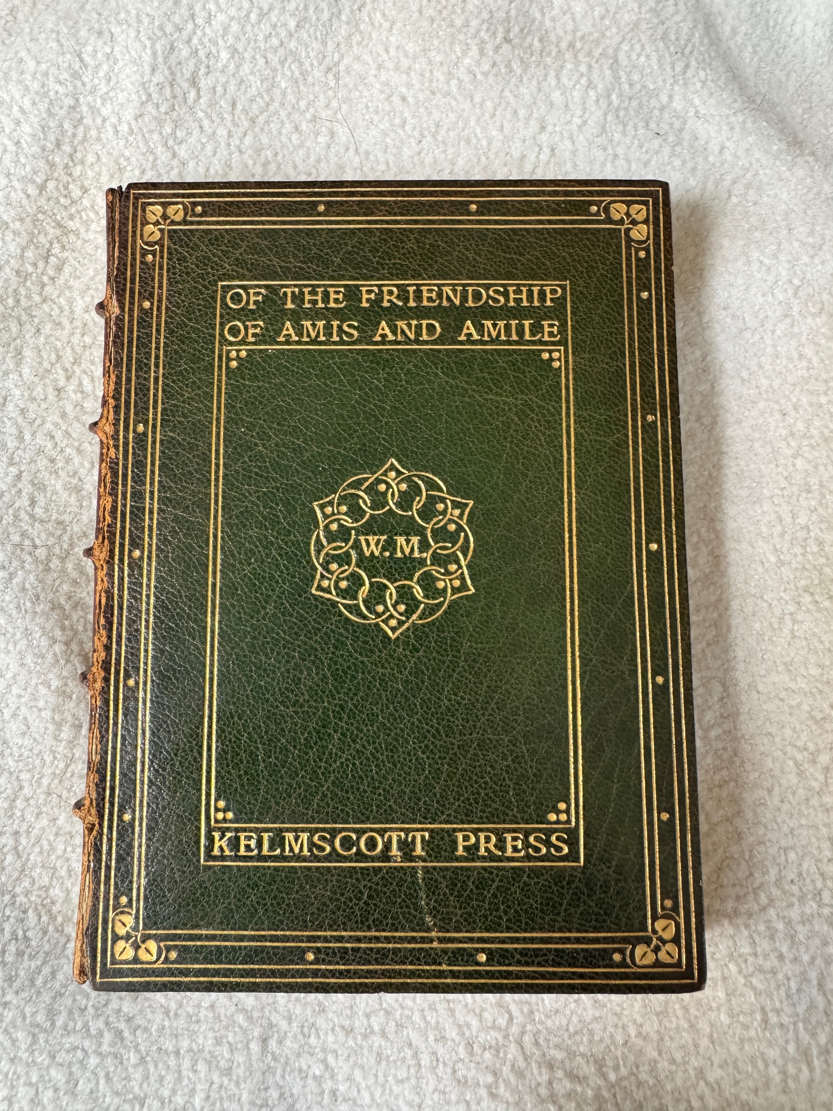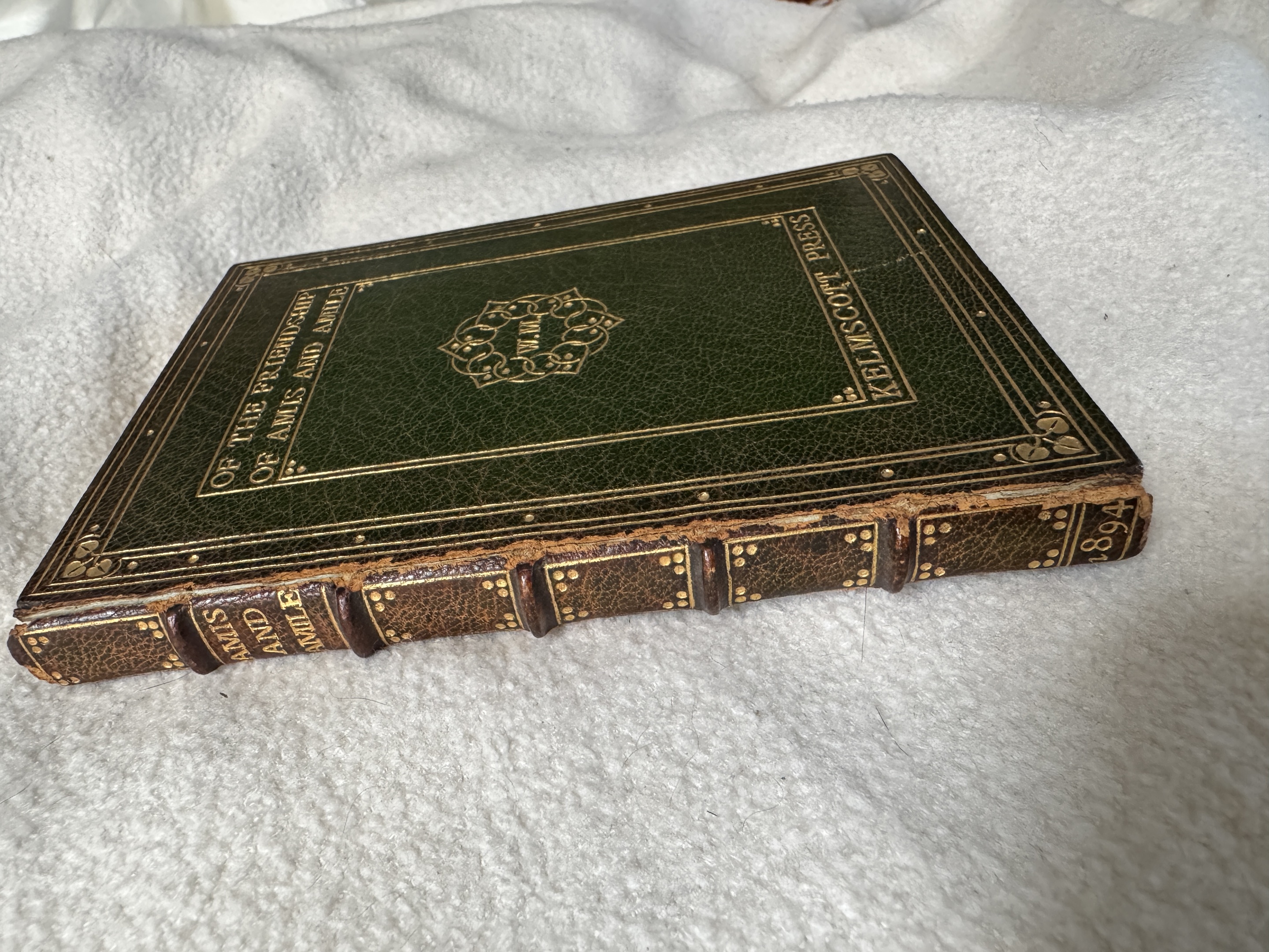 My find of the year and perhaps of a lifetime is this Sutcliffe bound Kelmscott, which I rescued from a pile of trashed books getting rained on. Tho it’s not one of the more popular of Morris’s Kelmscott series, it IS, as far as I can tell, utterly unique given the binding/title combination. I am currently seeking an excellent home for this beautiful book.