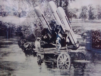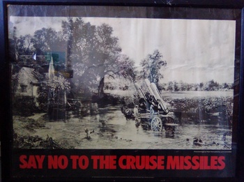 This poster uses artwork by the artist Peter Kennard for the Campaign for Nuclear Disarmament (CND). This version was published by the Labour Party in 1981 who were opposed to the conservative governments plans to allow the US to station nuclear missiles in Britain. It uses John Constable’s 1821 painting The Hay Wain, adapted with a battery of cruise missiles and a rather scary looking soldier looking back at the viewer. The famous work by constable was chosen to reflect the rural location of Royal Air Force Lakenheath in Suffolk that was used as a U.S. Air Force base and the plans to site 110 U.S. nuclear bombs there. Picture 3 shows constable's original.