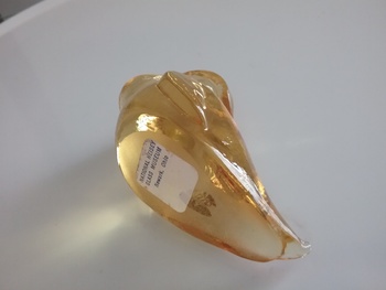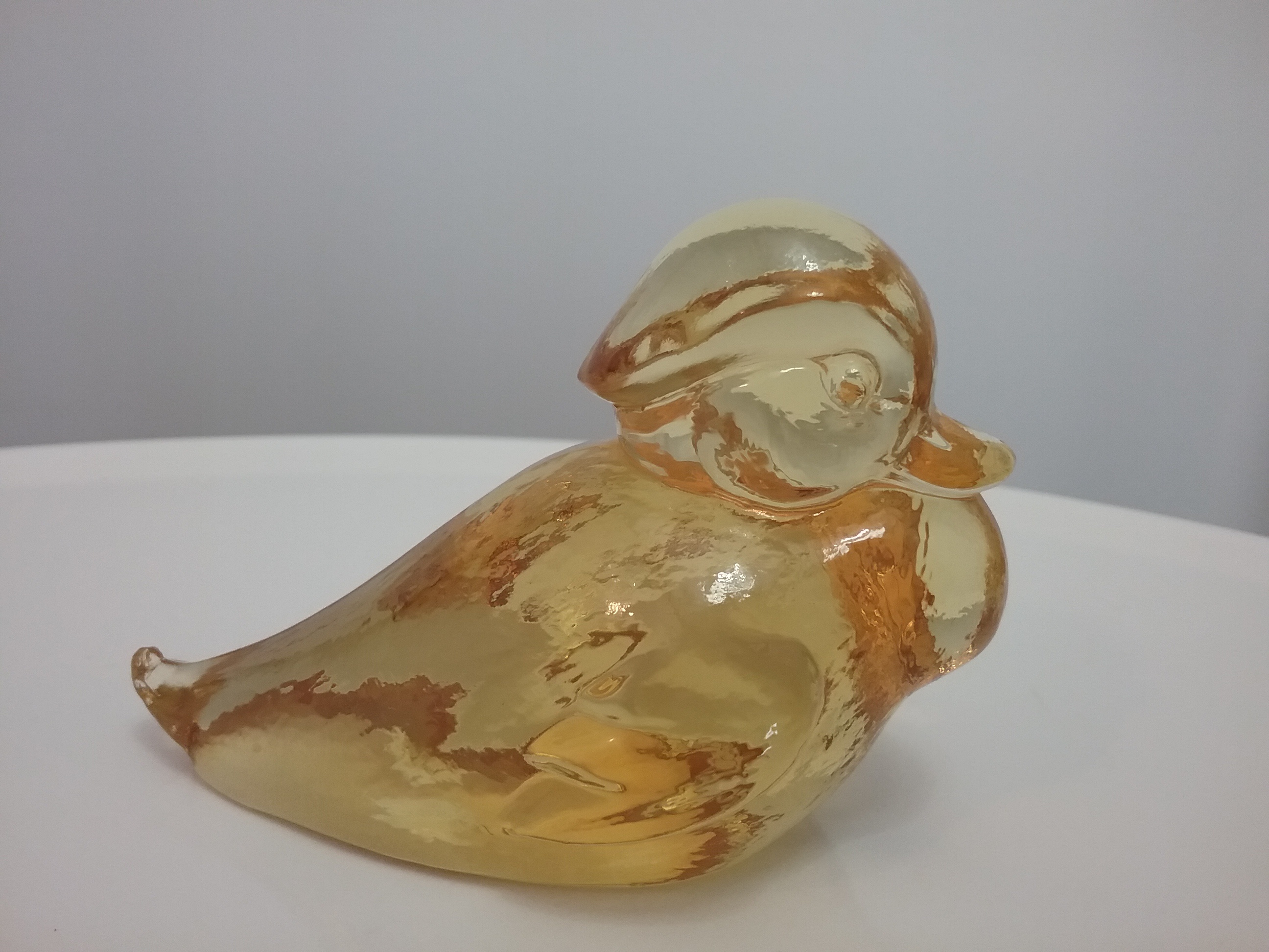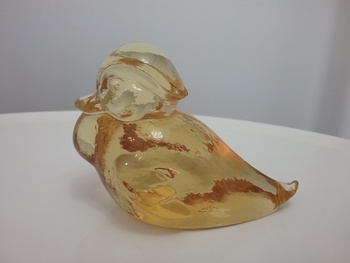 Here is a 3 1-2"W sunshine yellow glass duckling by Imperial Glass with raised IG imprint next to left wing, as well as orig tag from the National Heisey Glass Museum of Newark Ohio where originally purchased. From 1981, as seen in the book Glass Animals and Figurines by Coe. Original wood duckling design by Royal Hickman for Heisey ca late 1940s
