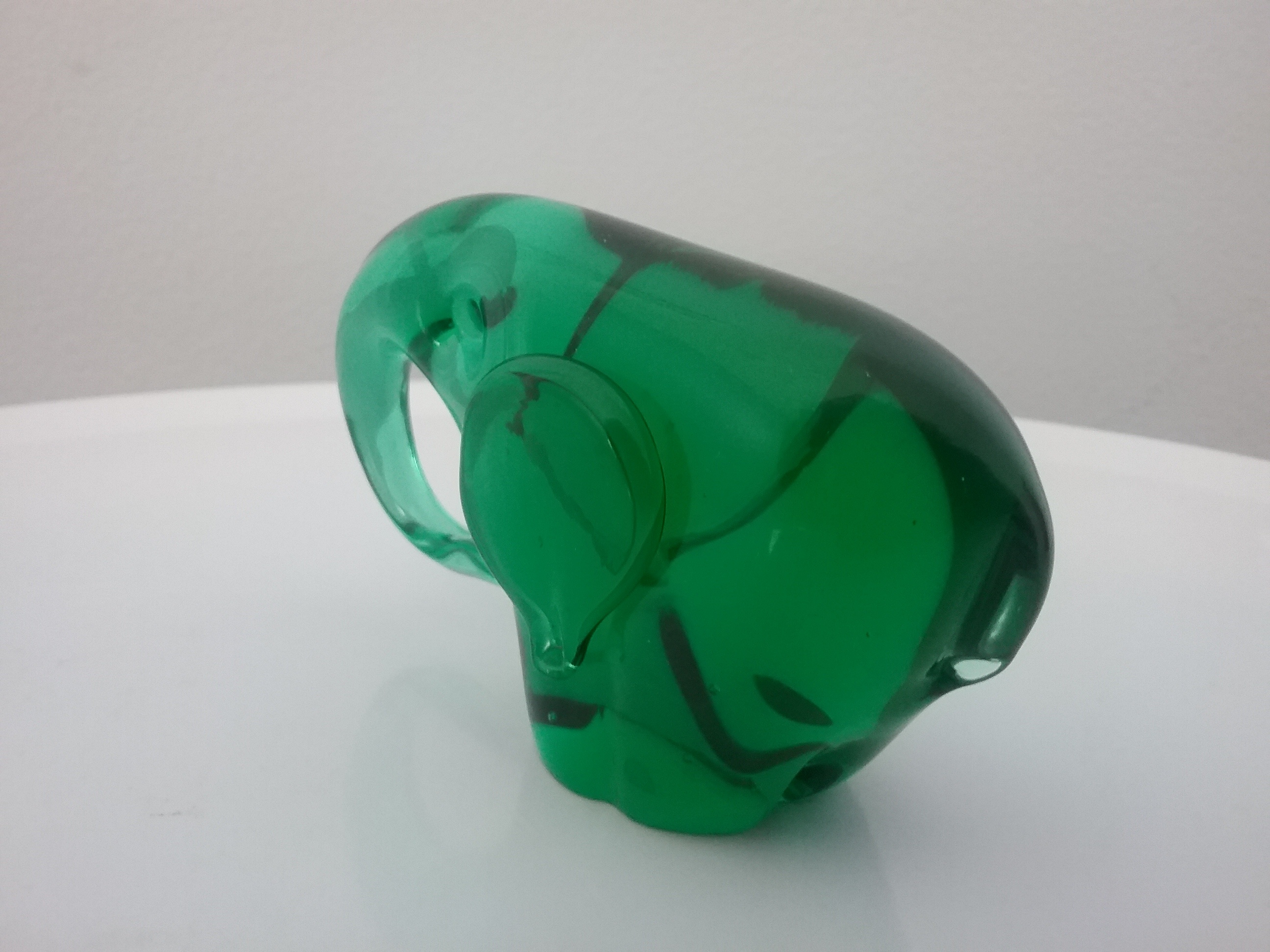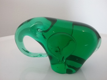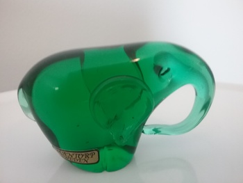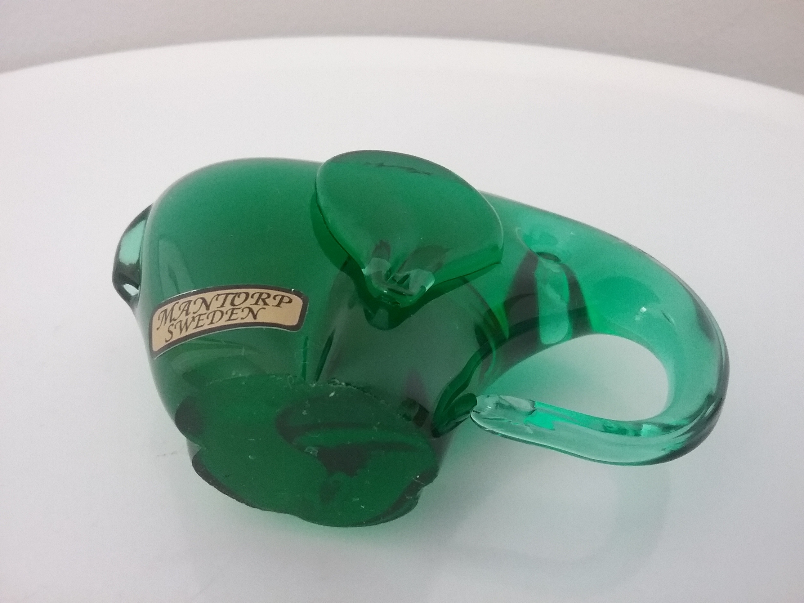 Here is a 3 1-4"W green glass elephant with curled under trunk, made by Mantorp Glass of Sweden ca the 1970s, with original gold and black label
