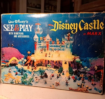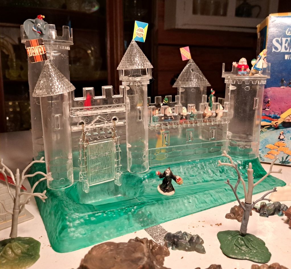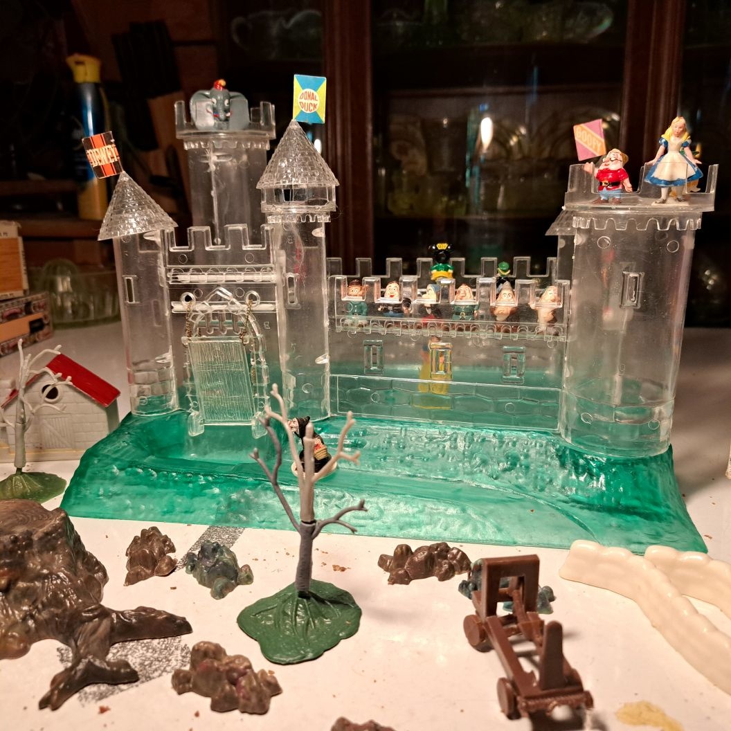 This playset was originally made for the Marx Miniatures Knights set. At least the castle was. It was remade in clear plastic with a semi-clear green base. It came with several Disneykins along with whatever random accessories would fit in.