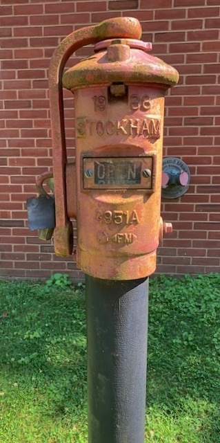 This vintage/antique firefighting item resides on the grounds of an old school, which is still active..