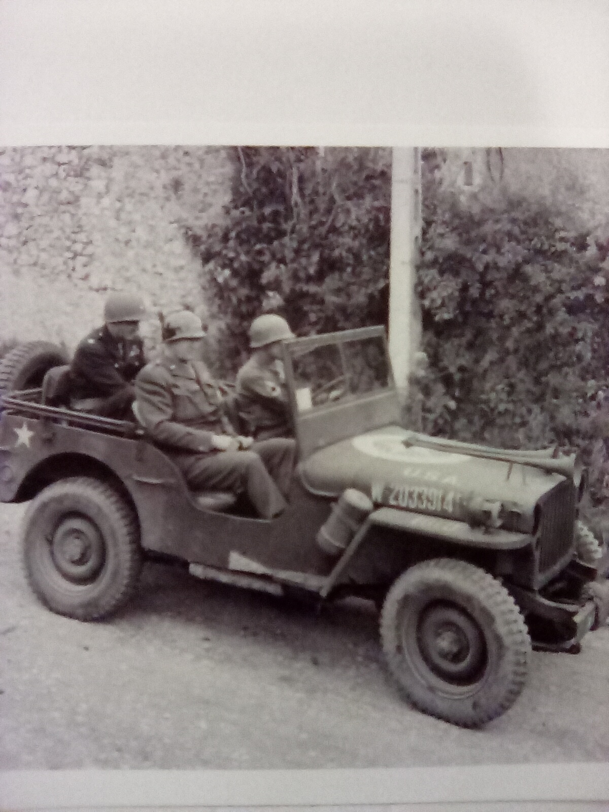 3rd photo of Patton in Army jeep with two other men in Normandy