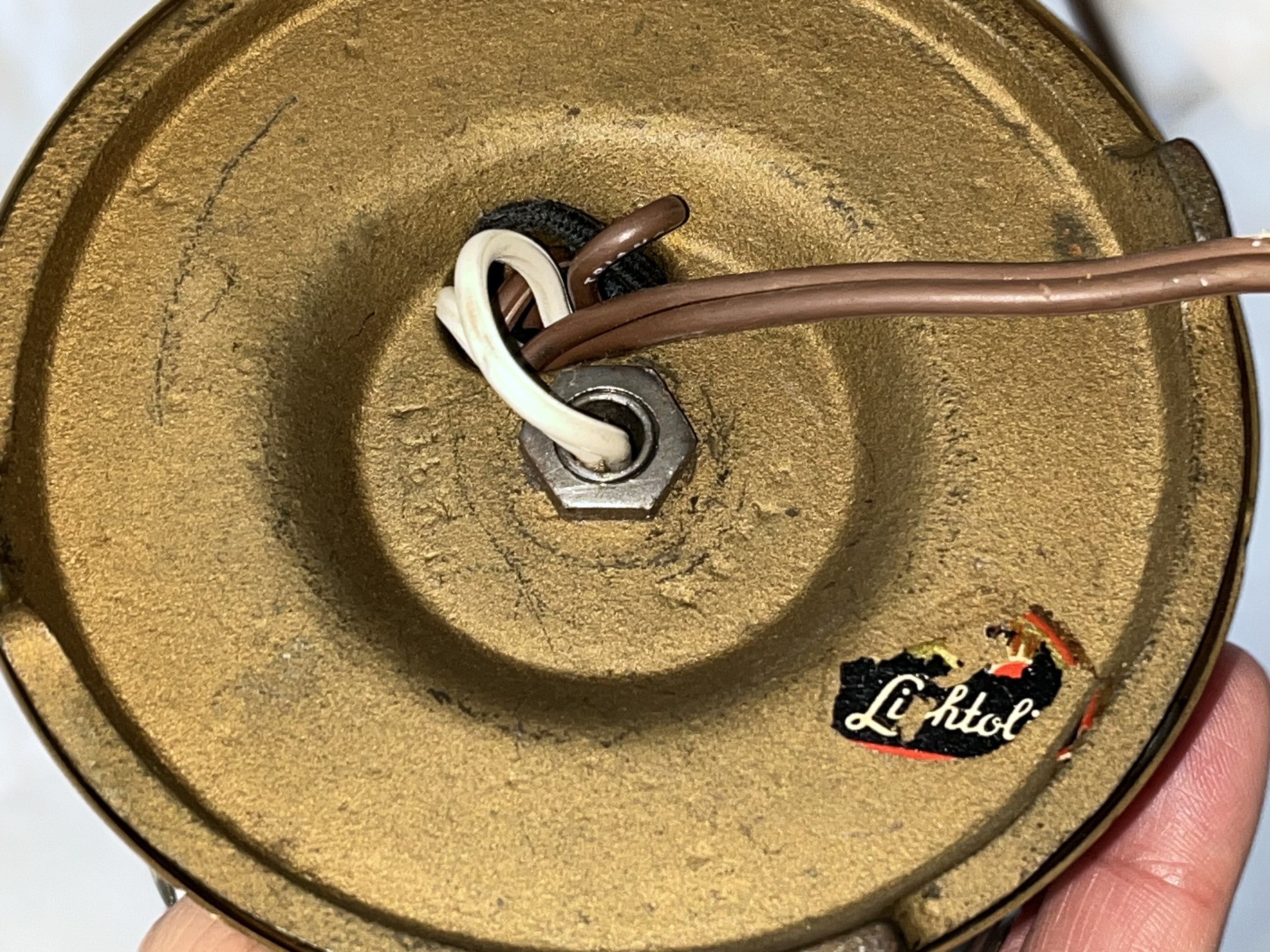 Hello, and thank you for taking a look. I am seeking information on this light, which appears to be a "Lightolier" brand (partial sticker shown). It looks to be brass and glass (or crystal?).