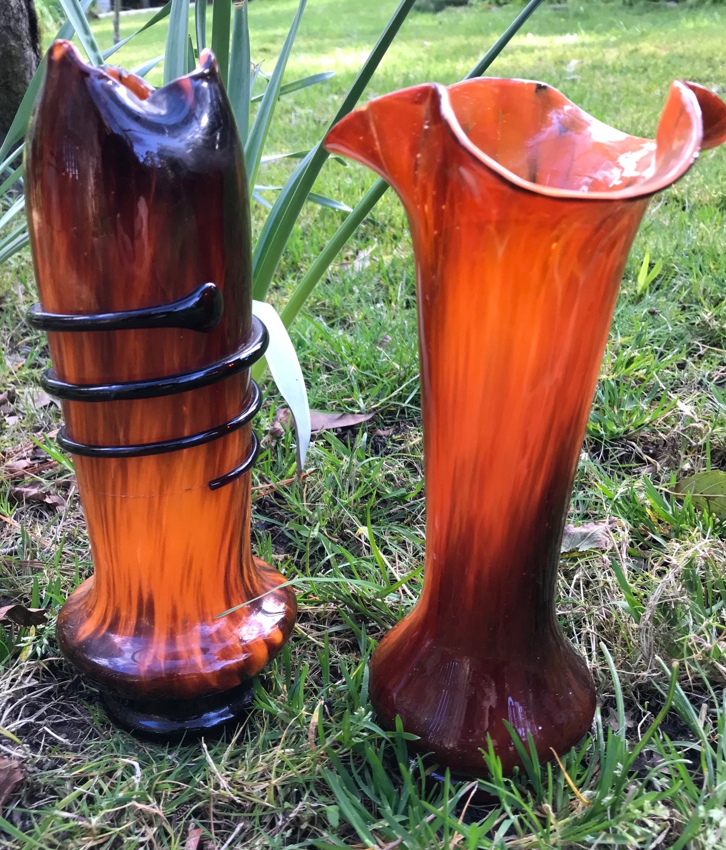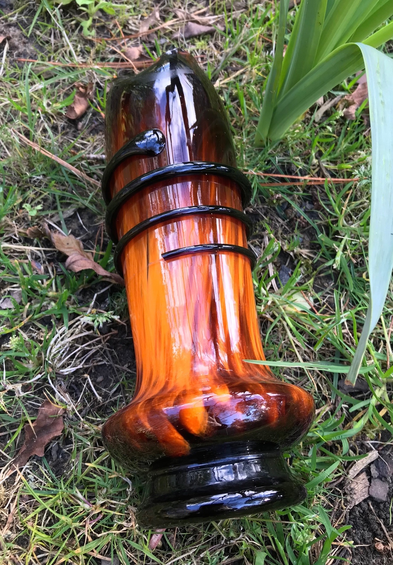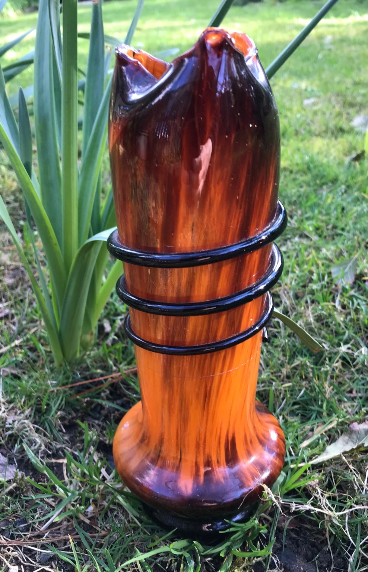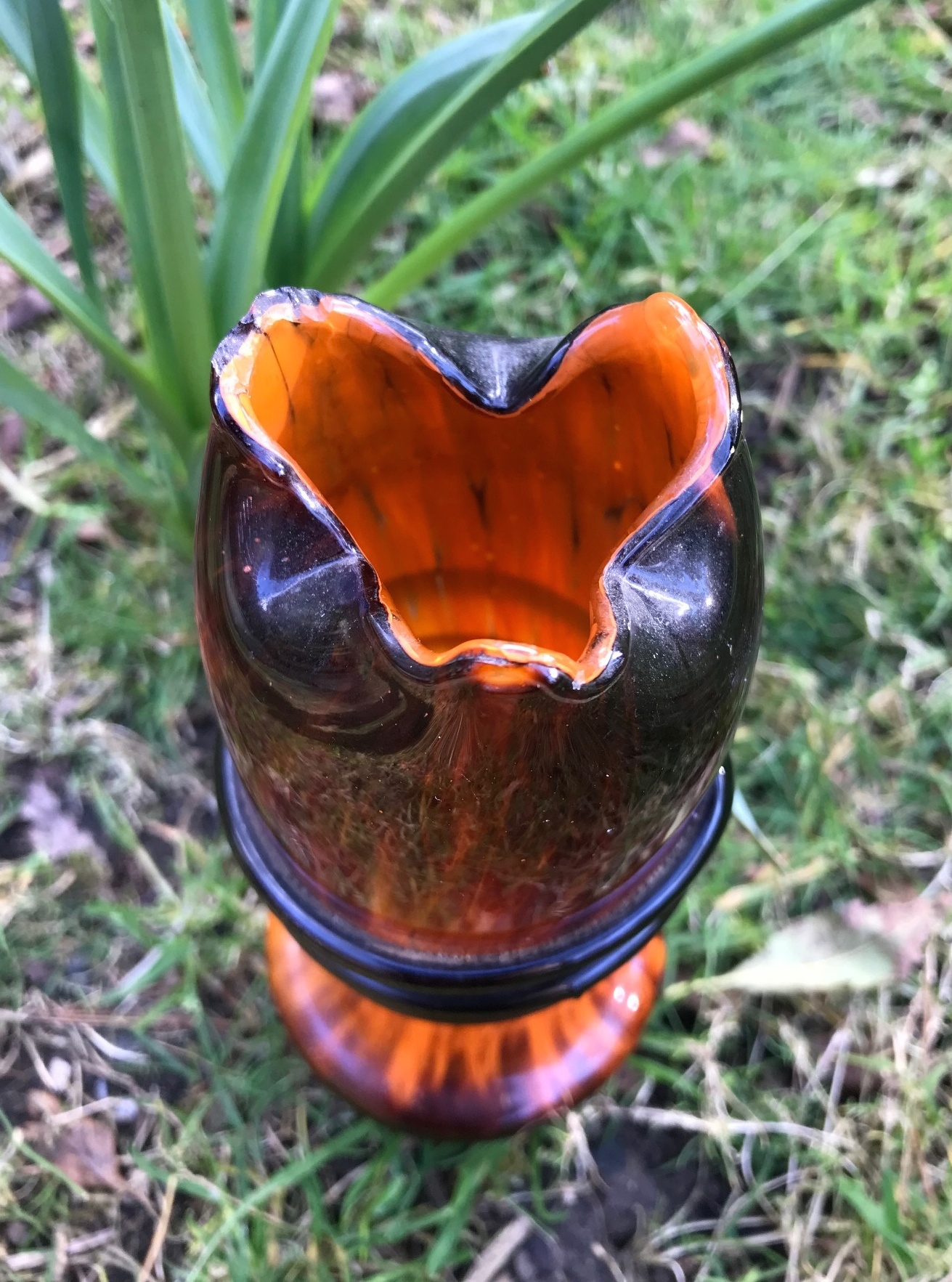 This vase is made from what looks like two layers of spatter glass - a dark brownish - red over deep orange. It measures 22 cm tall, 5 cm across the pinched up, three pointed top rim, & 6.5 cm across the base, which does not have a pontil mark.