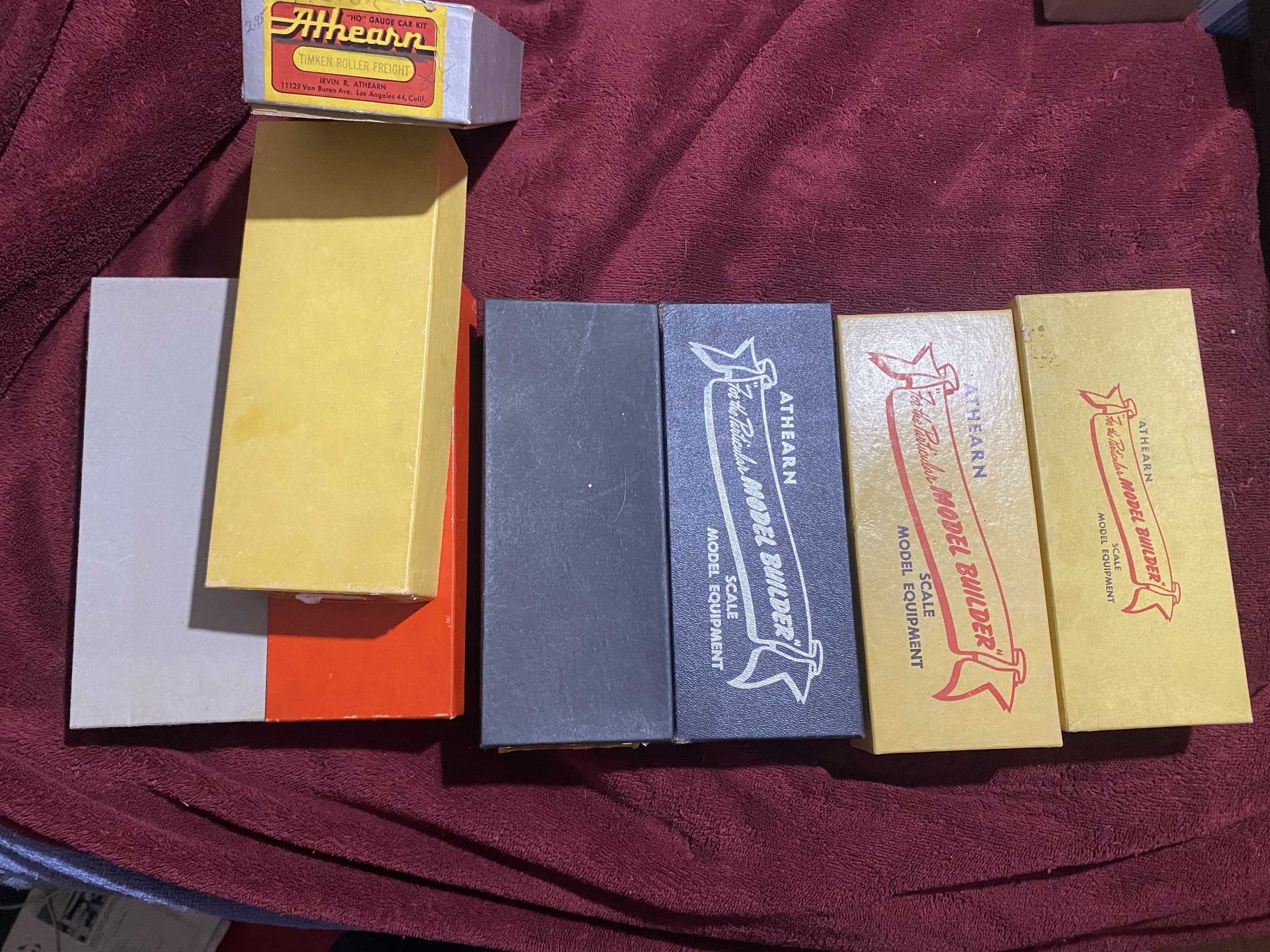 Shown here is the progression of Athearn kits, from left to right (first photo) from the beginning. The gray box was the first, he started using that one in 1948, and it was used about two year. The three boxes that are stacked up, were offered as special run type kits (Athearn’s first) in special boxes, in 1949, running concurrently with the gray boxes (I describe these in another post).