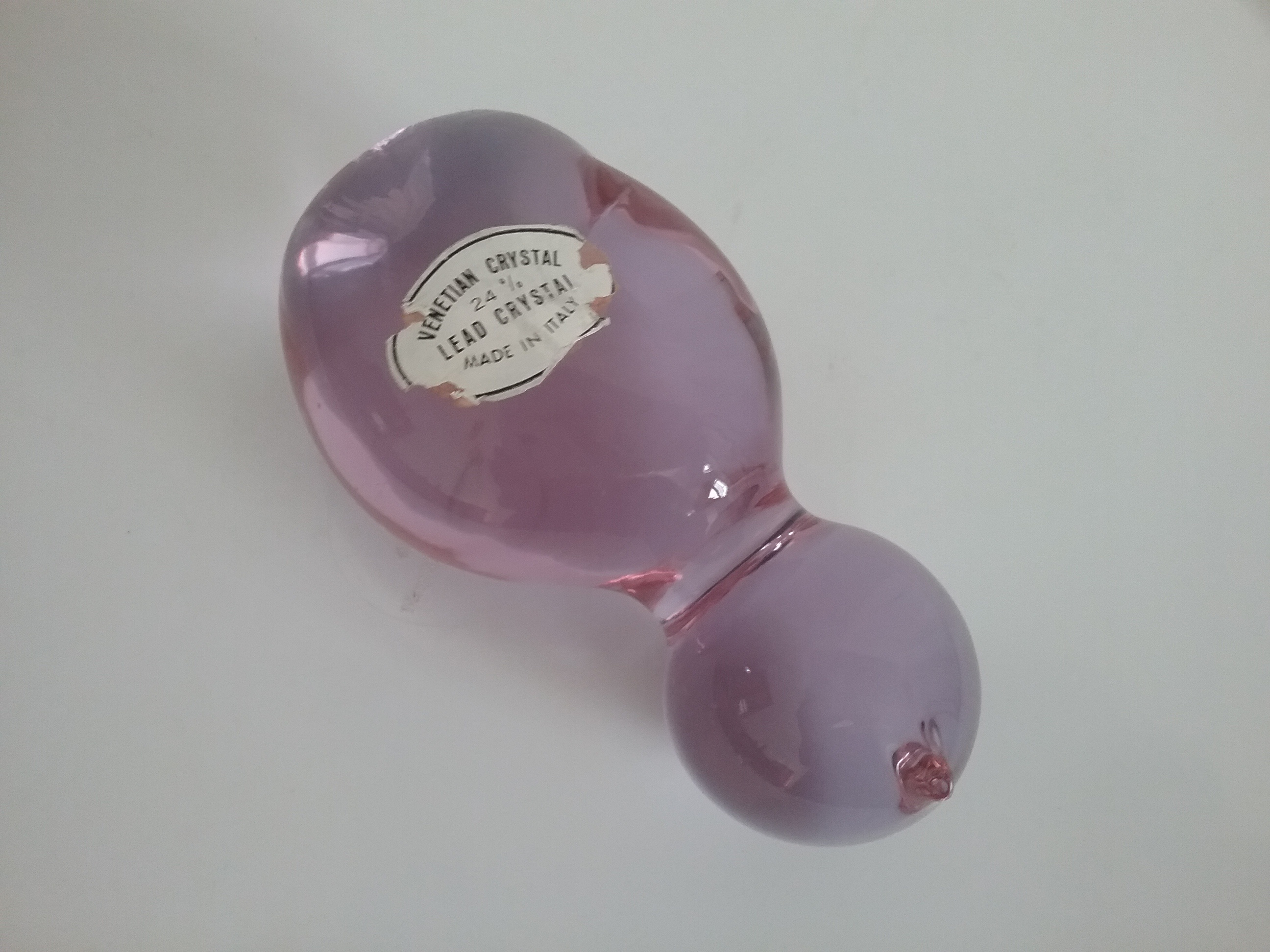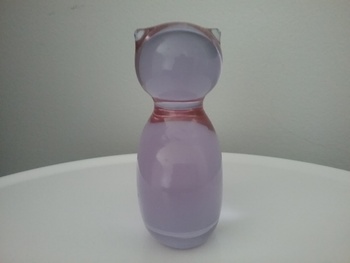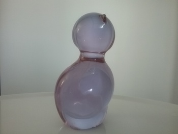 Here is a 4 1-2"H lavender neodymium glass cat with blue accents according to lighting. From Murano Glass with vintage silver & black label ca the 1970s
