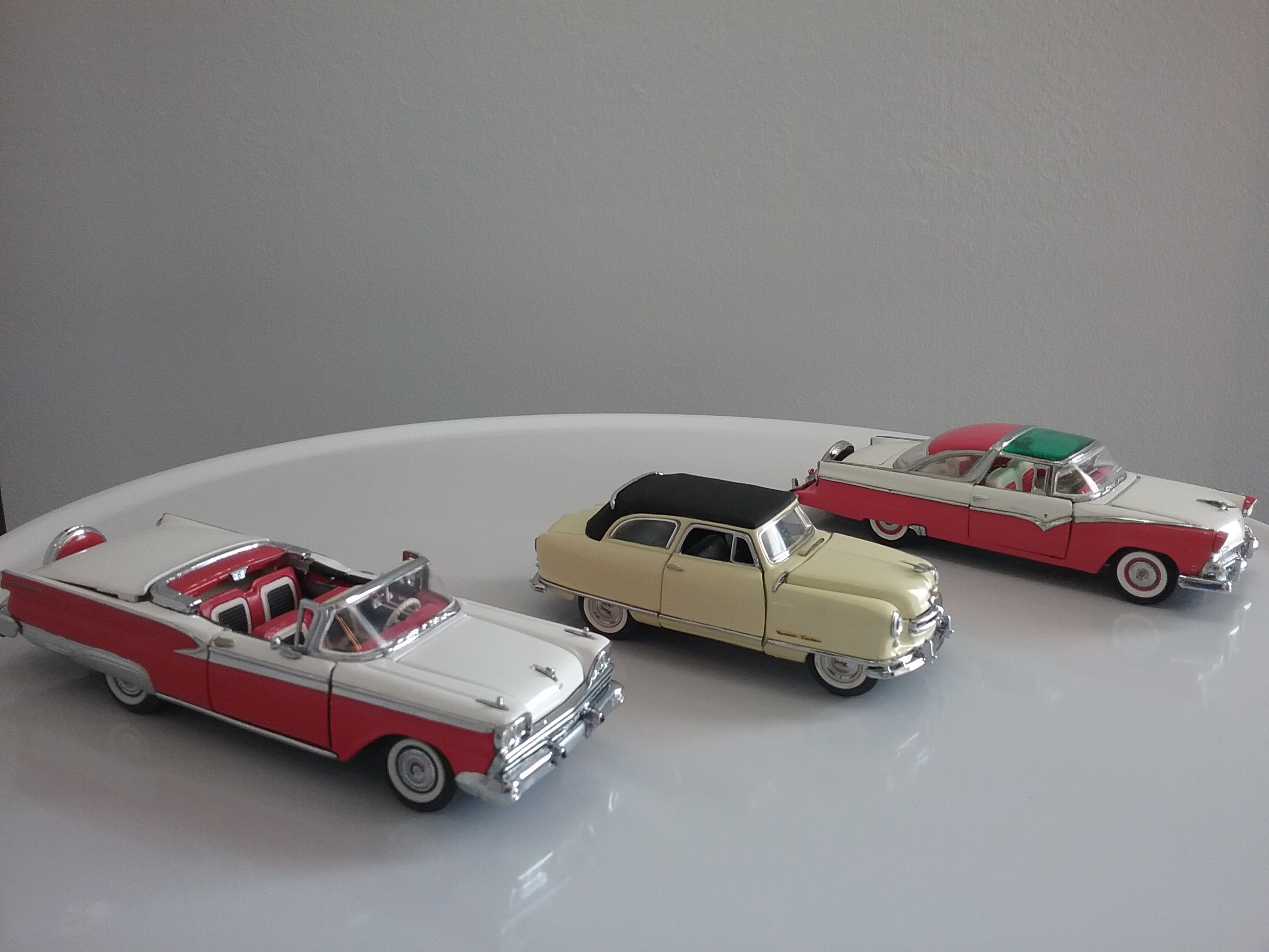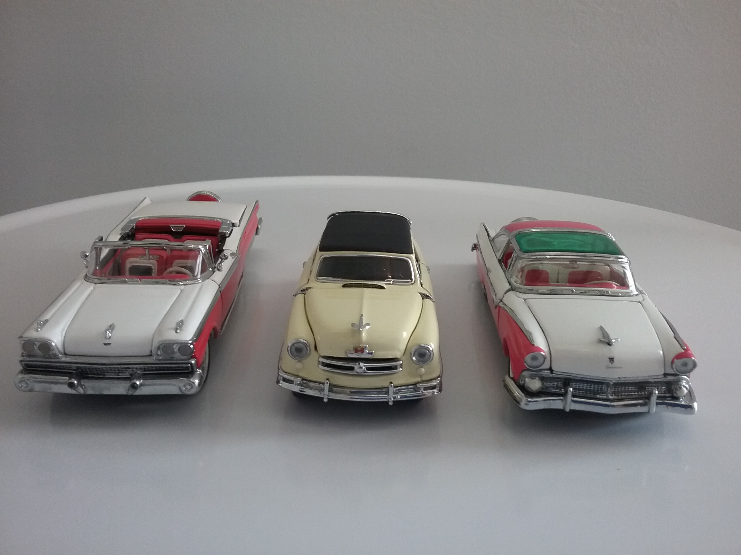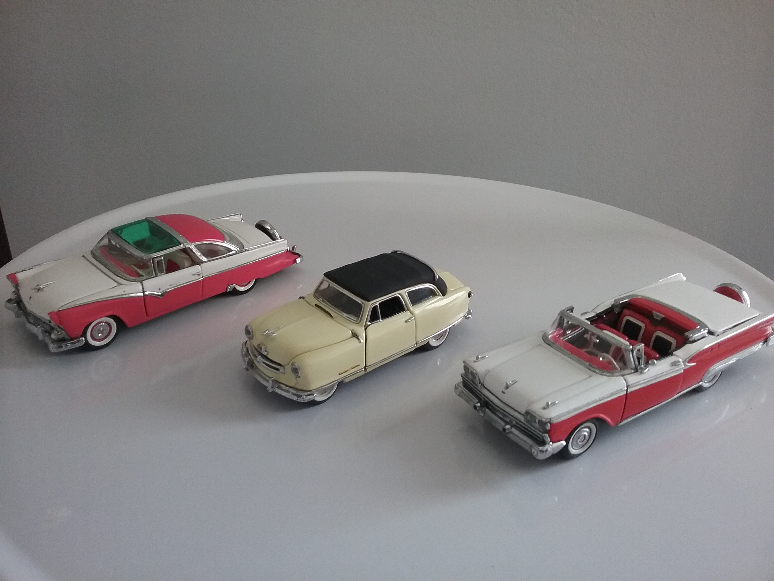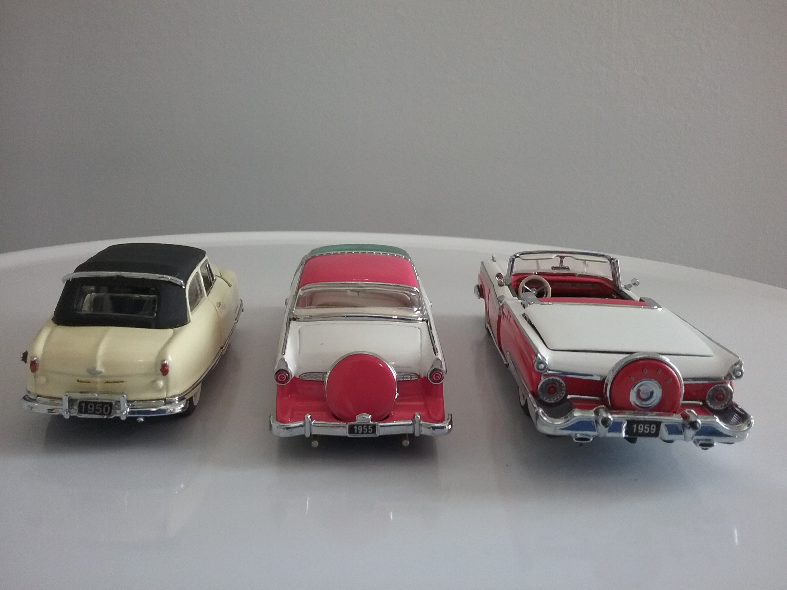 Here are three cars from the series Classic Cars of the 1950s by Franklin Mint made in the late 80s-early 90s. In first photo they are left to right 1959 Ford Skyliner Galaxie, 1950 Nash Rambler Airflyte, and 1955 Ford Fairlane Crown Victoria. Each car is approx 4"W or 1:43 scale. I tried to photograph from different angles, and back view shows year made on the plate