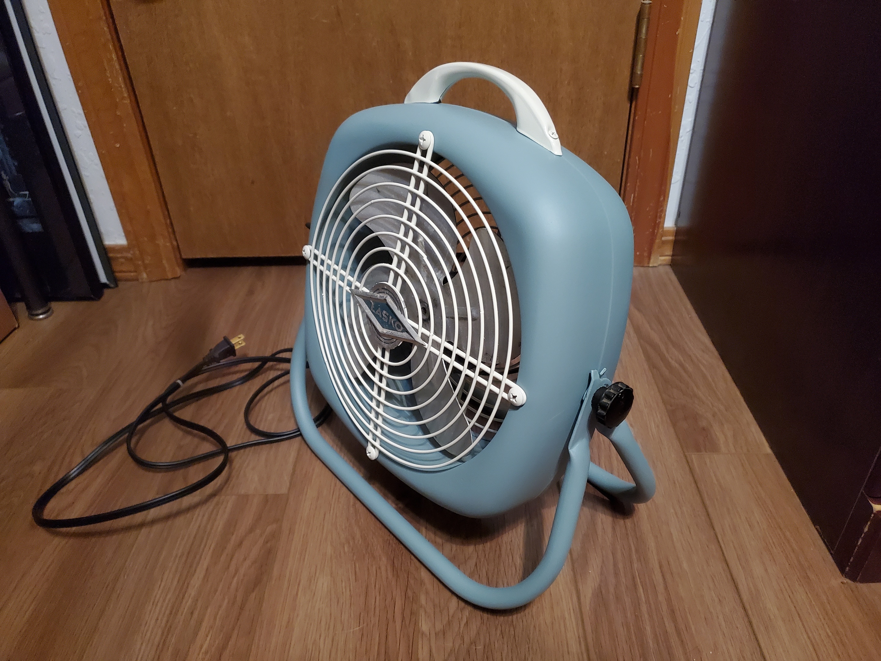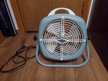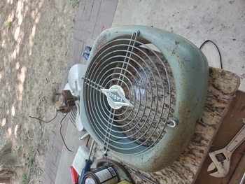 Lasko fan that I found in a junk store in Arkansas for $11. Easy rebuild and works great. Hardest part was trying to get close to original blueish color. Used Rustolium Coastal Sage.