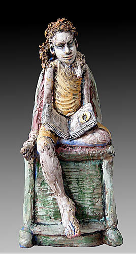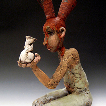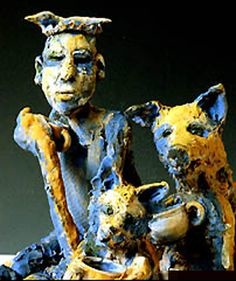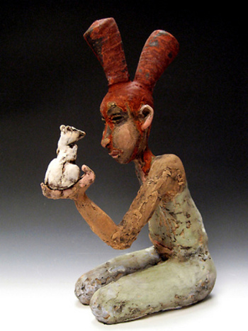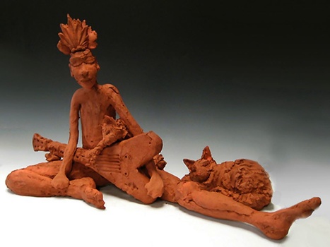 Some imaginative terracotta sculptures about people and their animal friends. Whimsical and humorous but also tender.