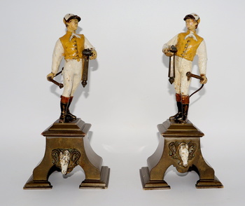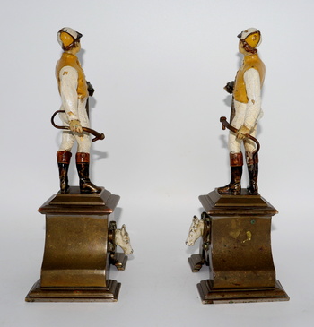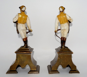 I have many jockey statues and sculptures in my collection, but these would be the oldest and most rare jockey sculptures I own. These are cold painted bronze and still retain their original bronze bases. These were made in France in the mid-late 1800's. As you'll see, these still retain their riding crops as well as the pieces they're holding. I'm not sure what those pieces are, perhaps they're trophies.