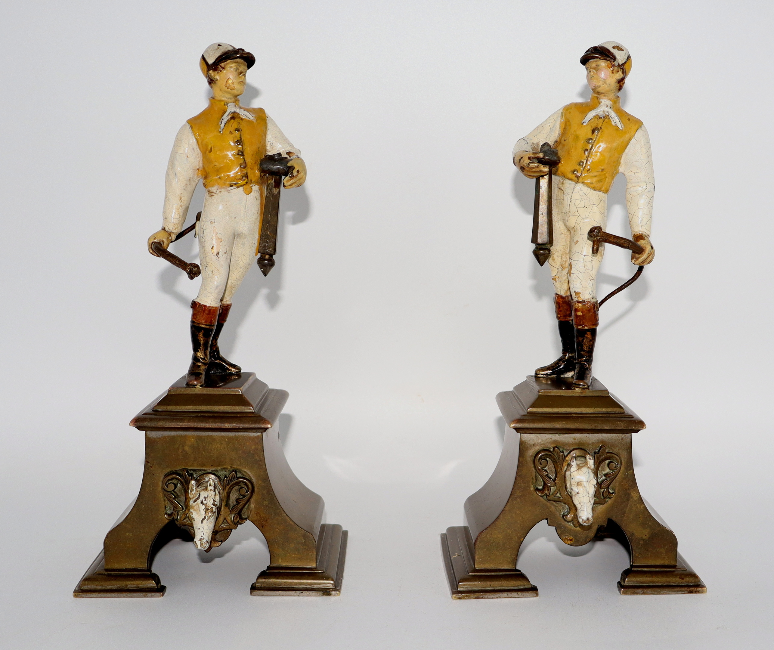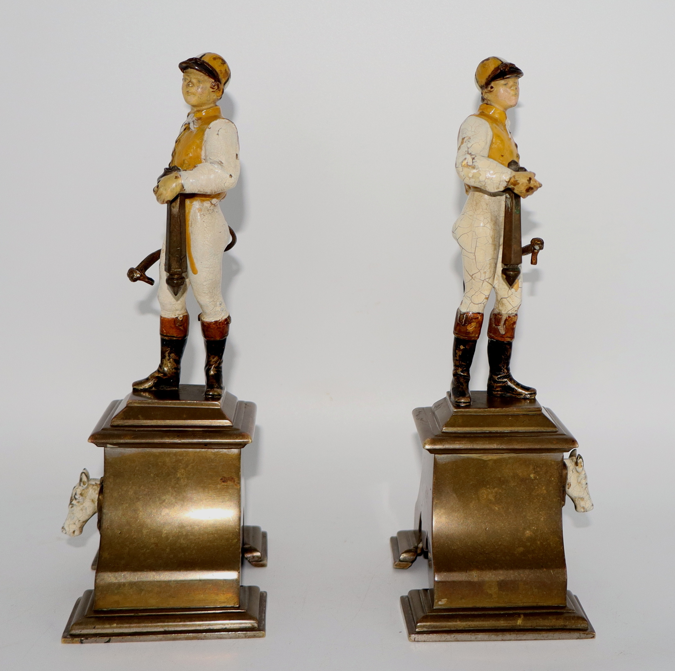 I've seen a few of these over the years and I happen to own another set that are not mounted on bronze bases and no longer retain the pieces that these jockeys are holding. Most are missing those pieces and the riding crops are most always broken off. They're solid bronze and hefty for their size and each weigh nearly 2lbs. They each measure 7 3/4" tall and the bases measure 3 3/4" wide and 2 1/2" deep.