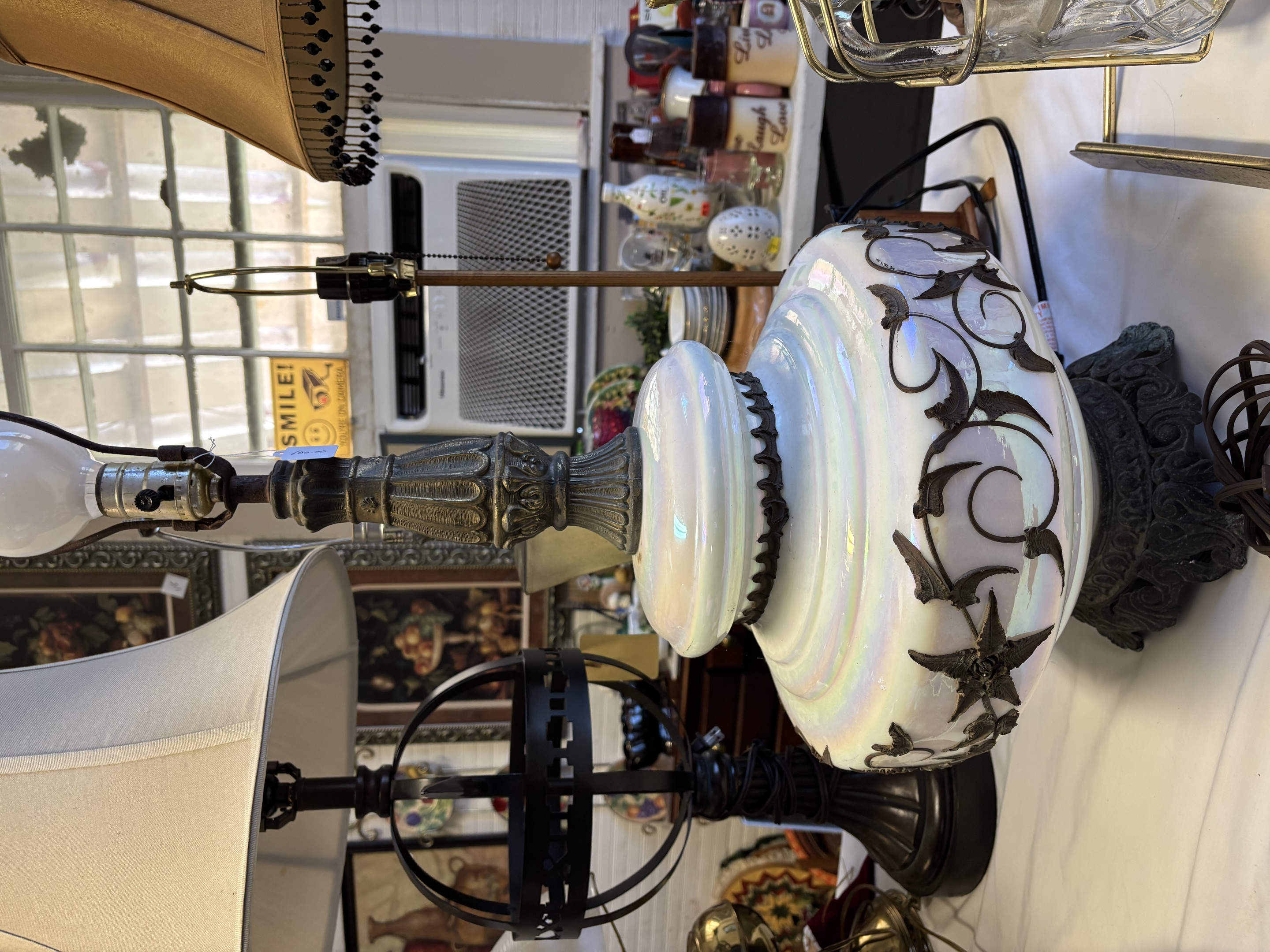 I believe this is a Mail glass and brass lamp. Honestly, I would love to find a shade to go on it.