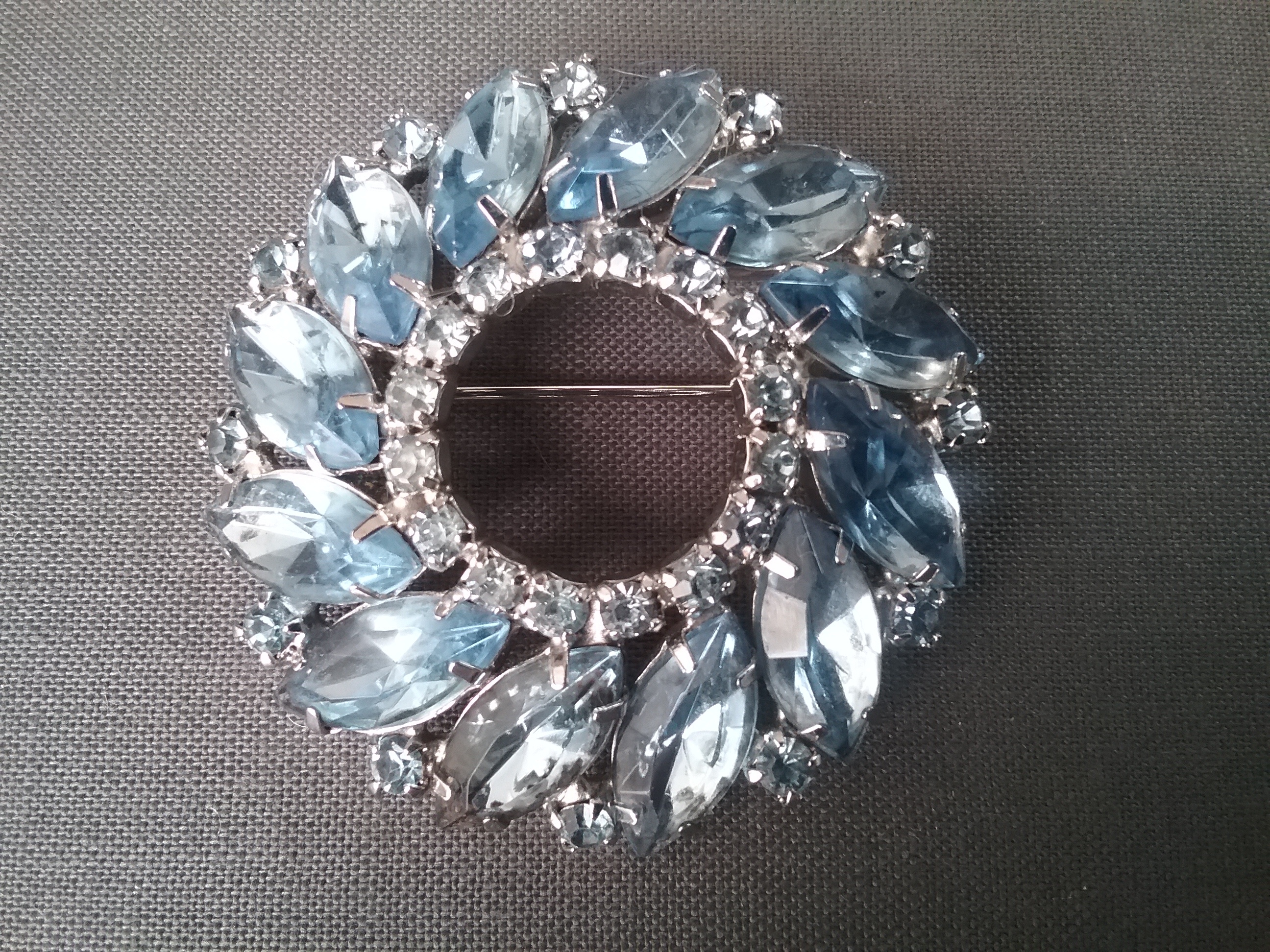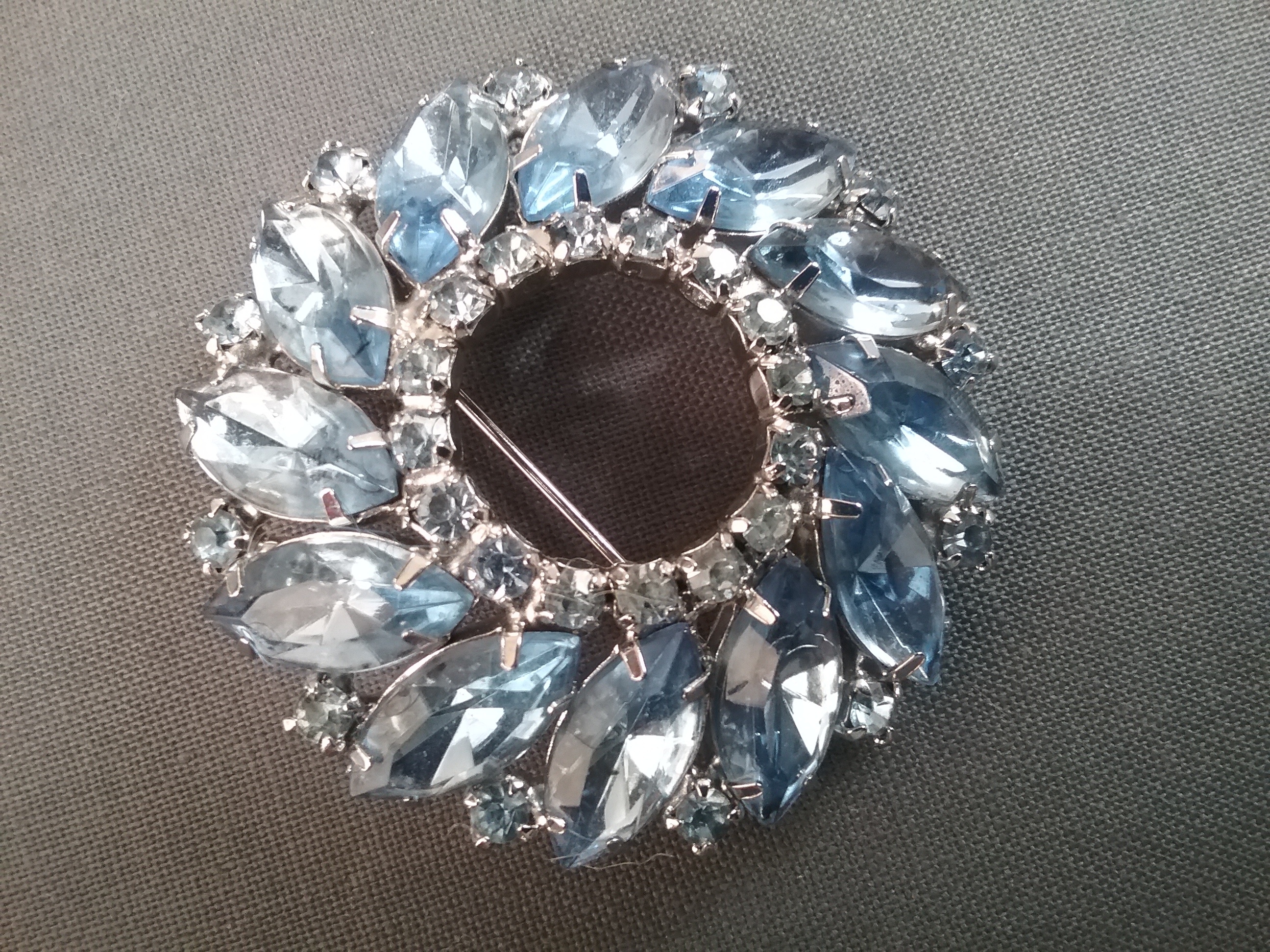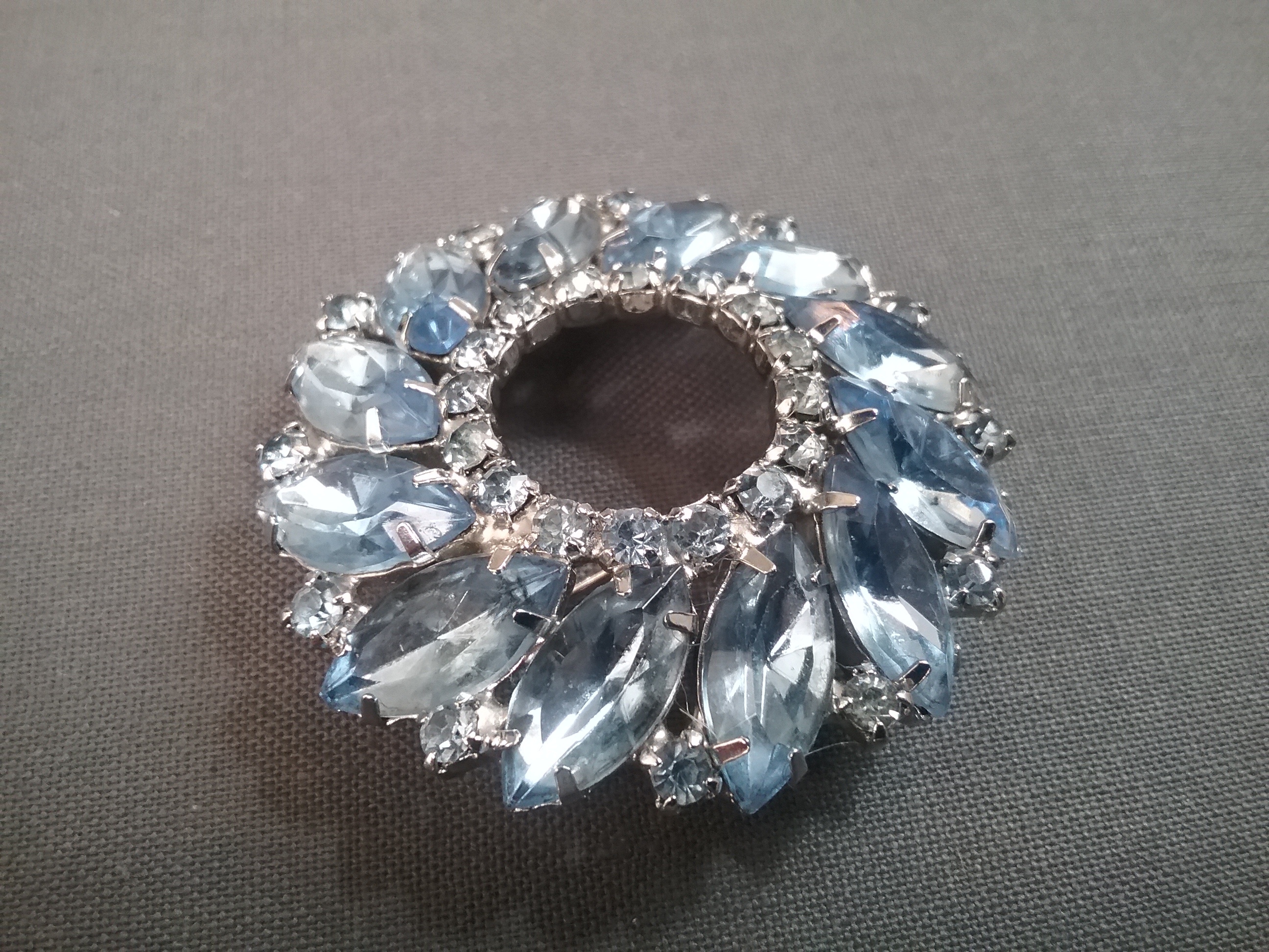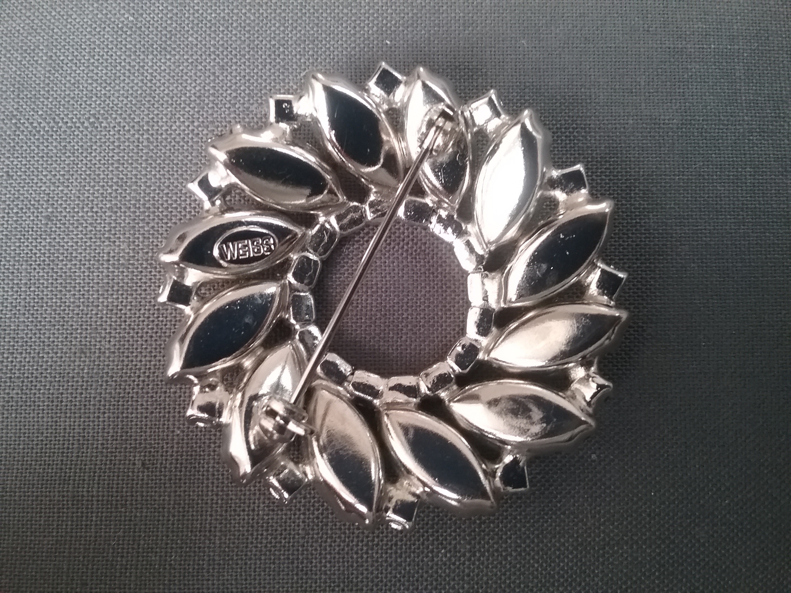 This 2" silvertone brooch has lt blue rhinestones of different shape, and is marked Weiss in oval on back. From the 1950s
