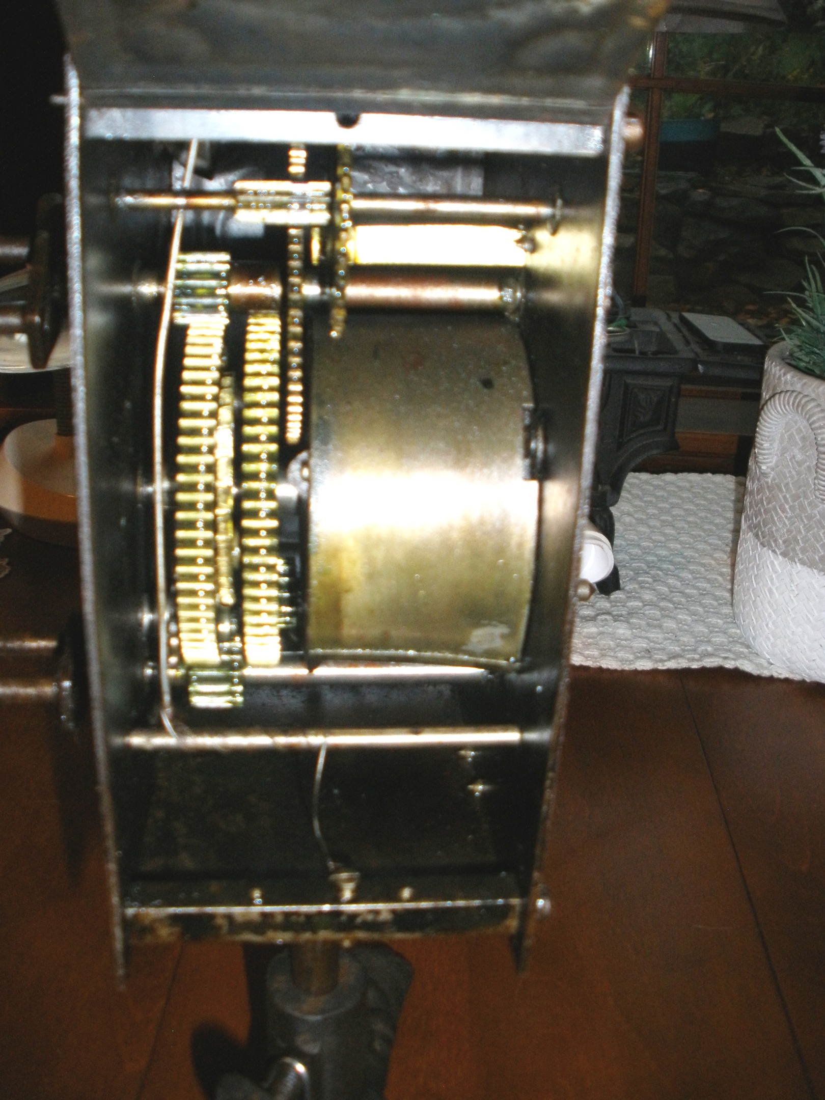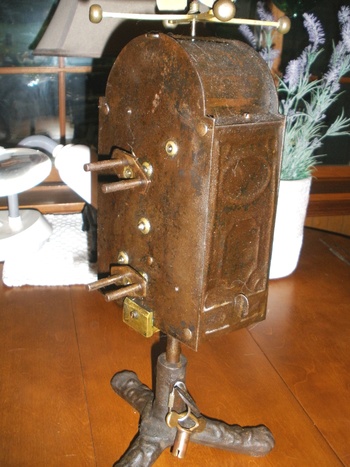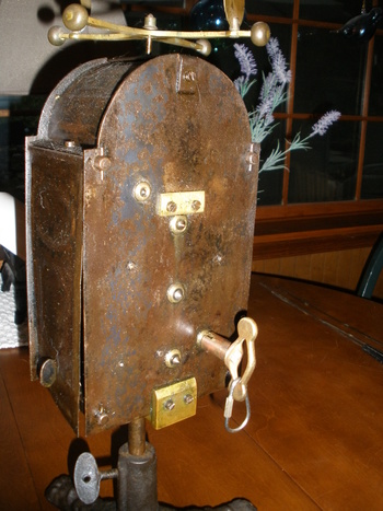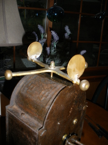 This spit jack was used in front of a walk-in fireplace to rotate a spit with meat skewered to it. It would rotate at a selected rate of speed, set by the operator to obtain the best cooking of the meat. It would be wound up, and on this winding, it would run for 25 to 30 minutes. The speed by which it rotated was set by the two circular disks on the top of the governor of the spit jack.