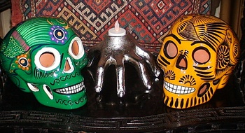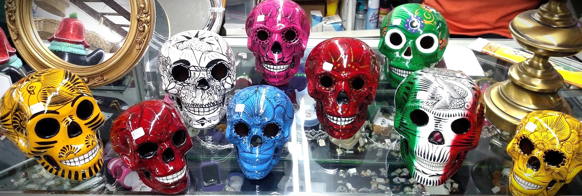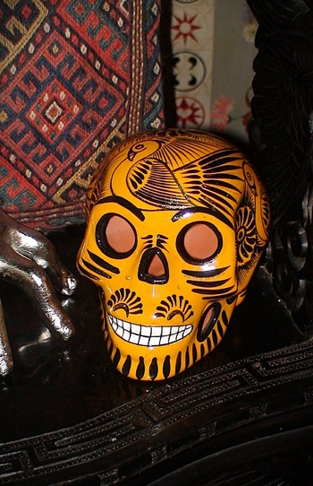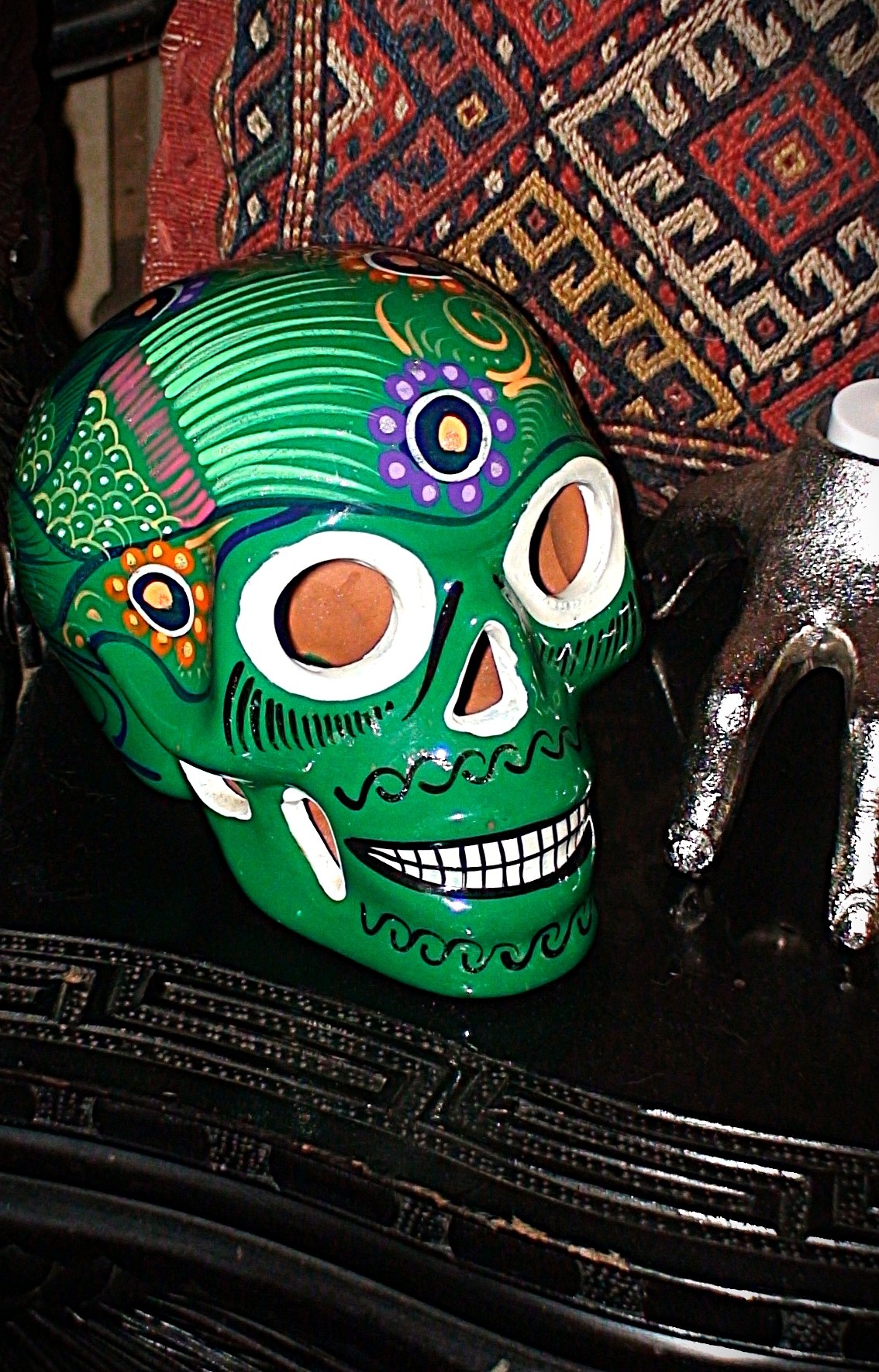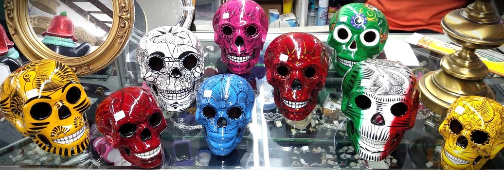 I found these at a local antique shop. I have discovered that the original ones were made out of sugar. These are made from clay and hand painted. The owner of the shop purchased them in Mexico. The last photo shows the skulls in the shop.