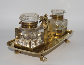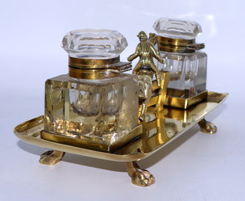 Another of my equestrian themed inkwells if this steeplechase inkwell. The ink bottles are glass, possibly crystal, and are very similar to Baccarat ink bottles. But I'm no glass expert by any means, so perhaps one of you might determine that for me. With the exception of the ink bottles, the remainder of this piece is brass. The previous owner attempted to polish this piece, but there was a tremendous amount of brass cleaner residue in every crevice of this piece. I was able to remove the residue and polish this piece properly. The ink bottles do have a few chips here and there, but all in all its in pretty good condition for it's age.