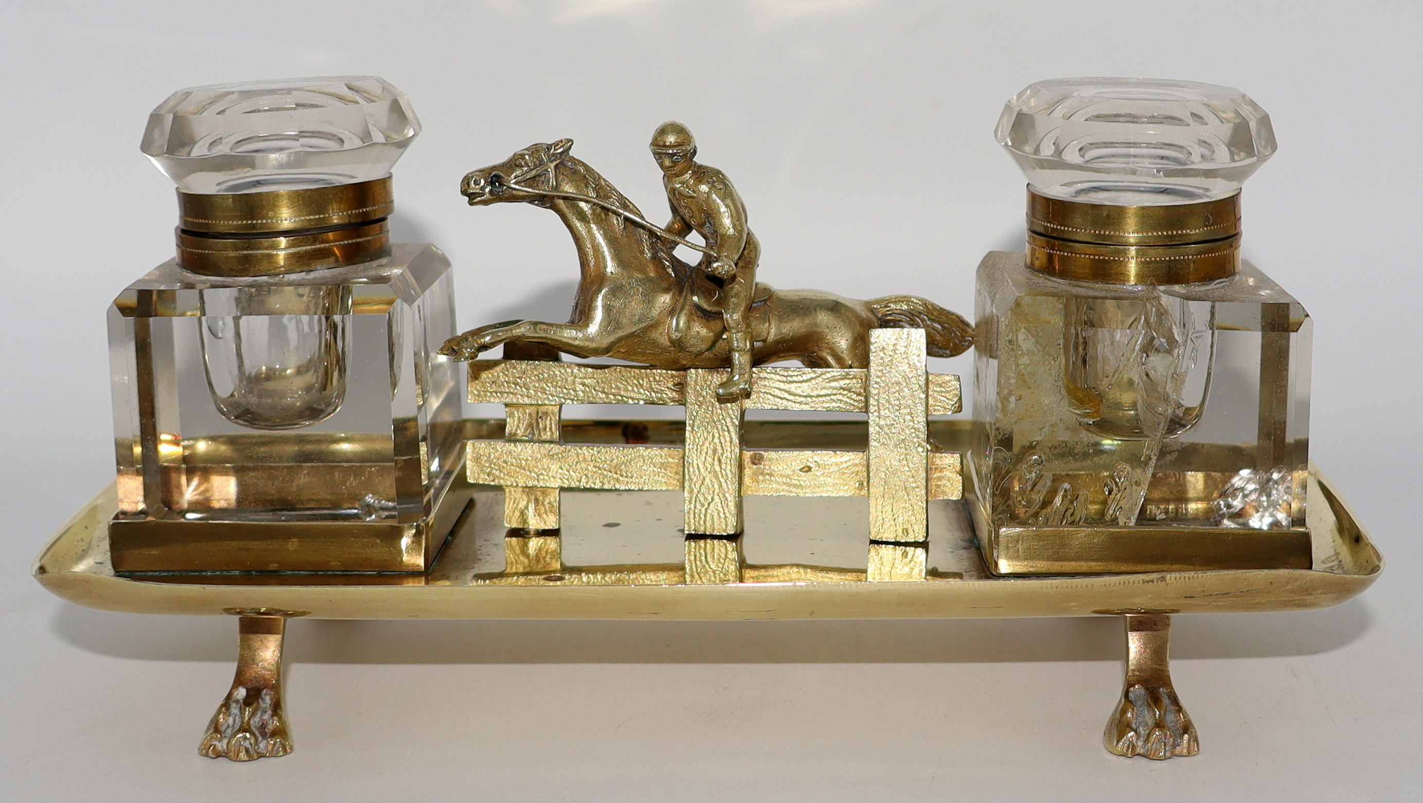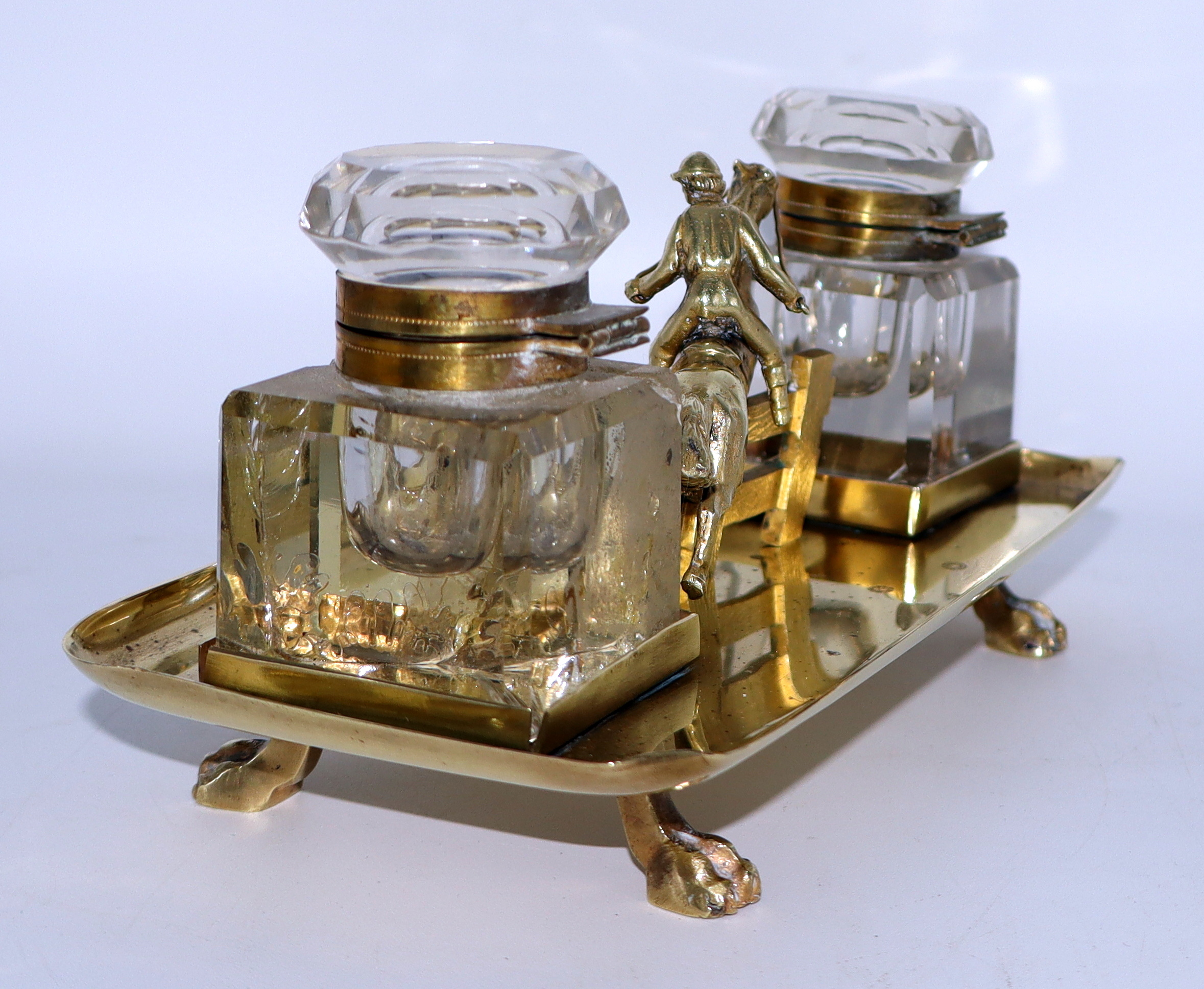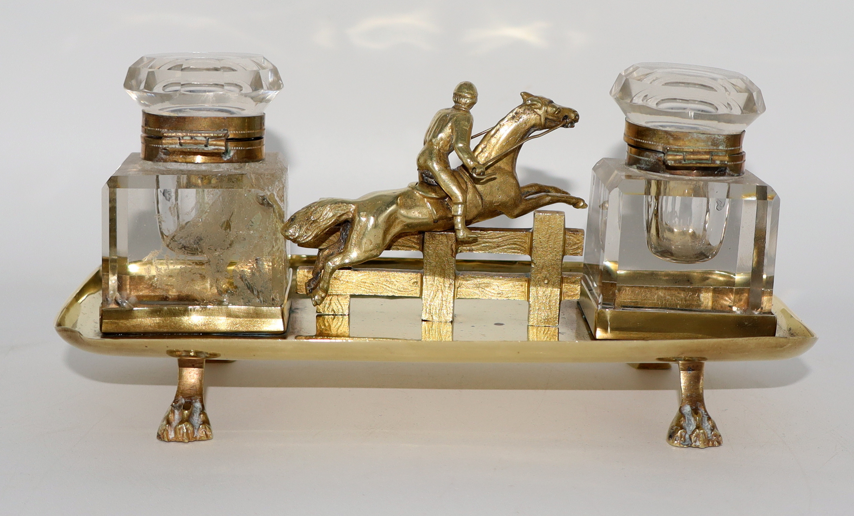 Most elegant steeplechase inkwell set, the detail of the jockey's head turned, horse and fence is really superb