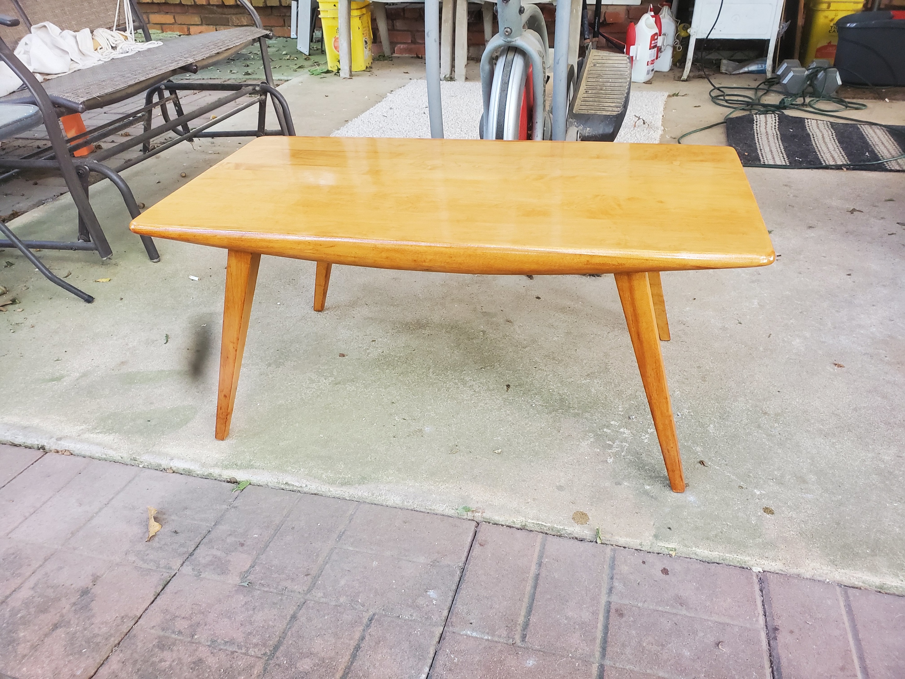 Haywaood-Wakefield MCM coffee table circa 1950's. Was an absolute disaster that was about to tossed in a dumpster. A lot of patience and elbow grease got shining like new.