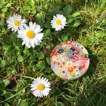 This is a closepack millefiori on a lemon yellow ground. Original label is intact, condition is perfect.