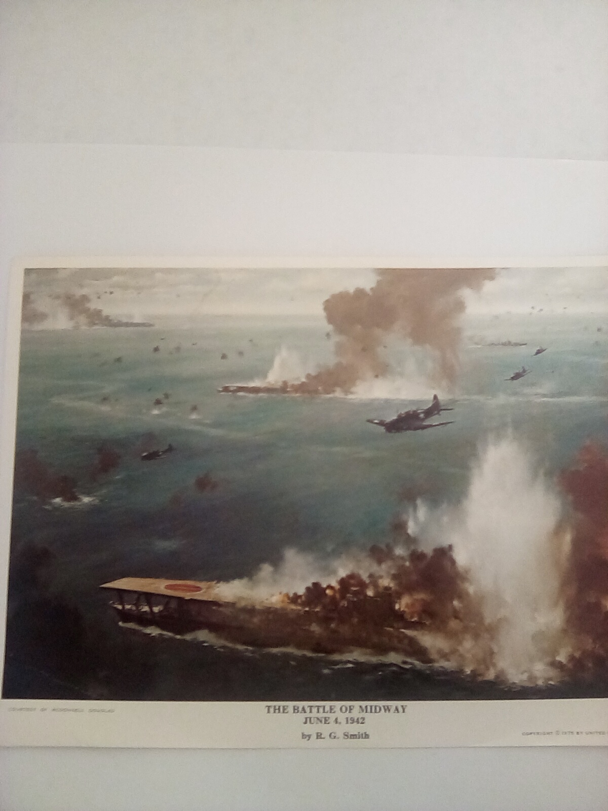 The battle of Midway was a major naval battle of World War Two between 6/4-7/42 at Midway Atoll in the Pacific. First picture is a painting of the battle by RG Smith