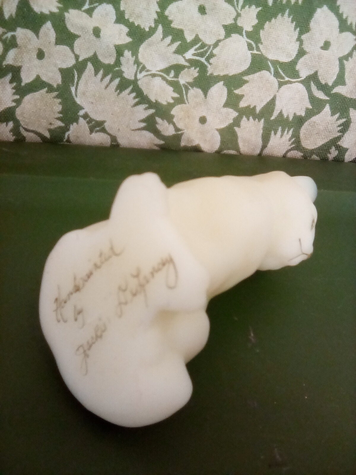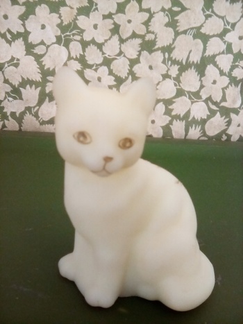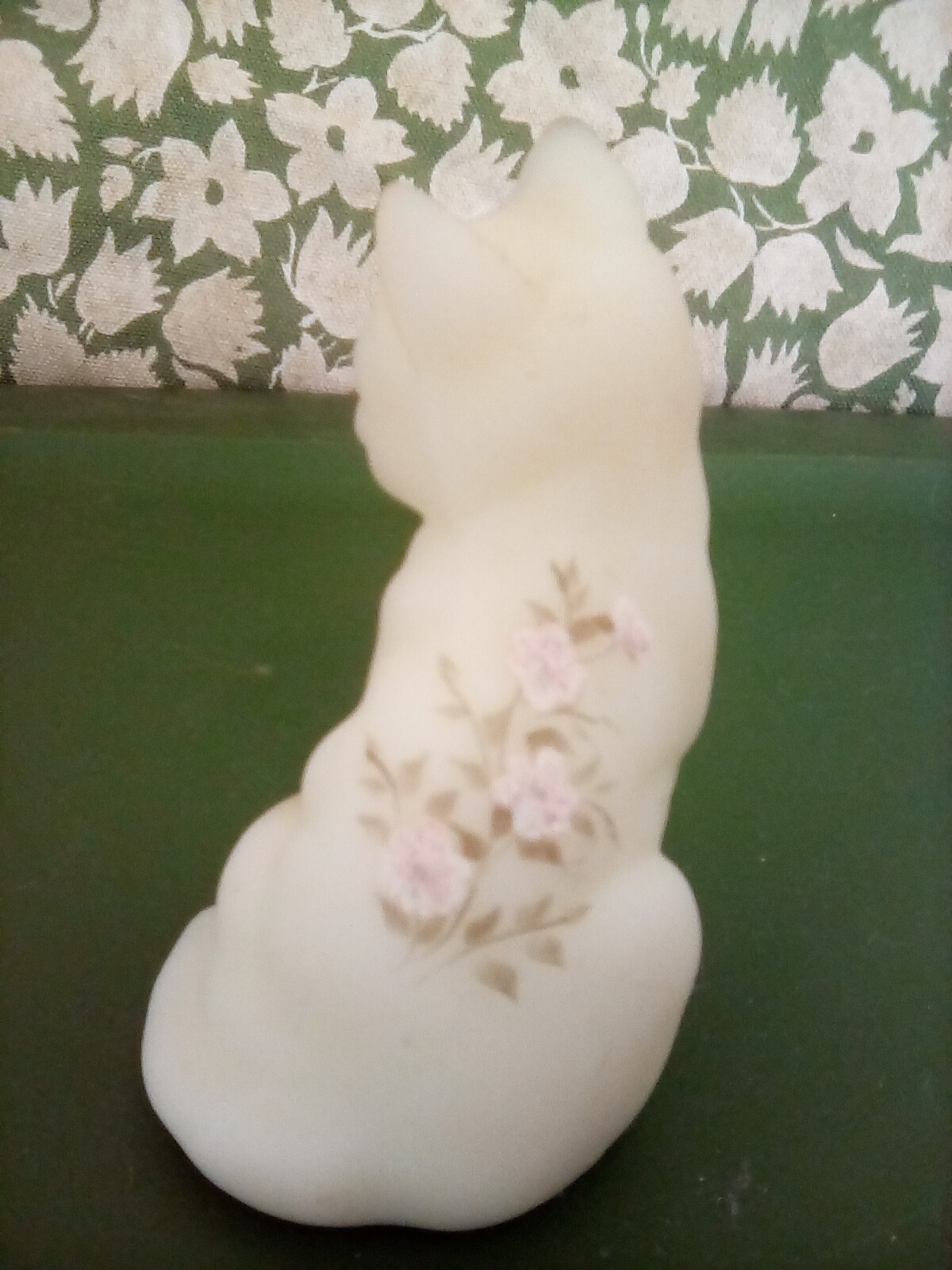 My favorite cat is custard glass by Fenton. It has a painted pink flower branch on back, artist signed Jackie DeLancey