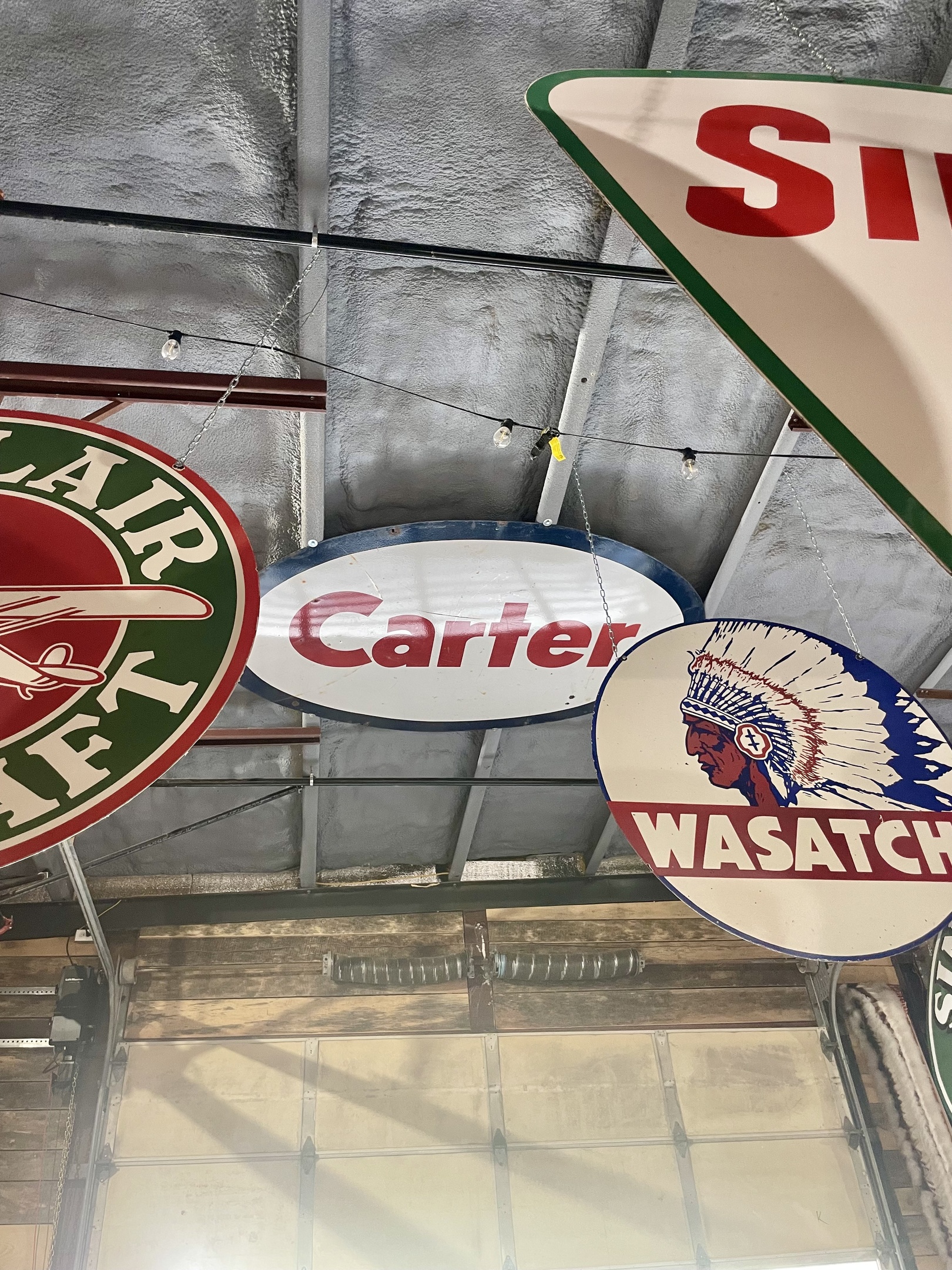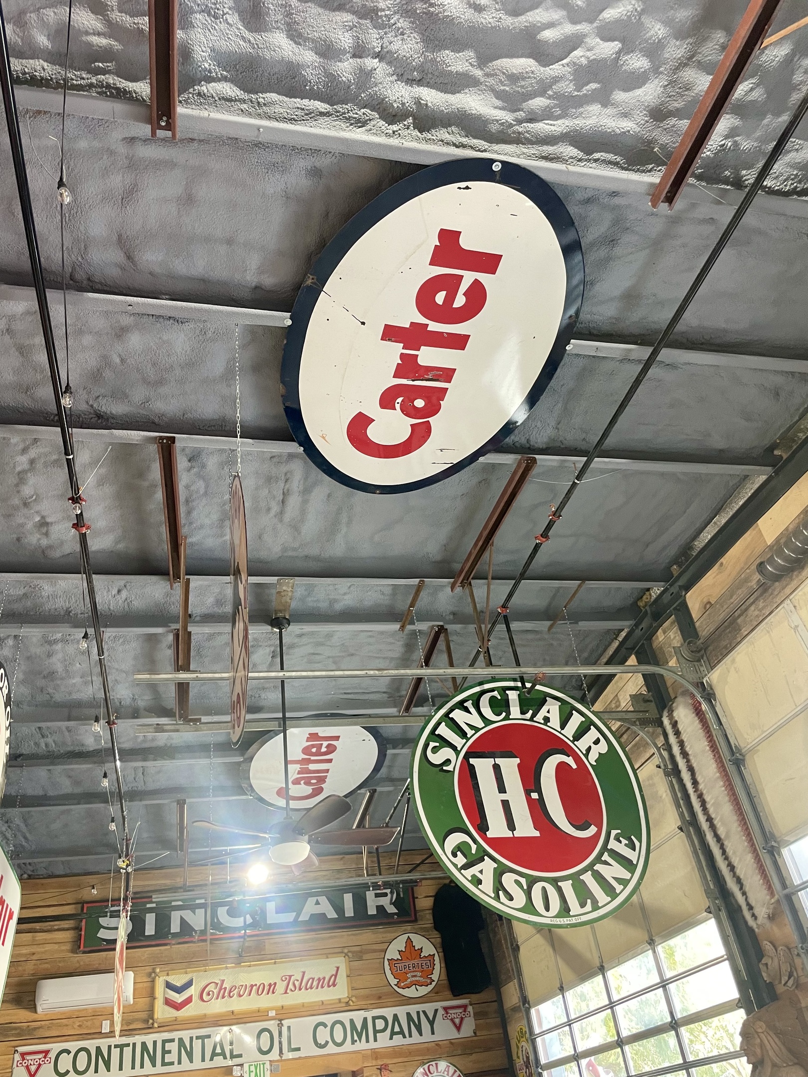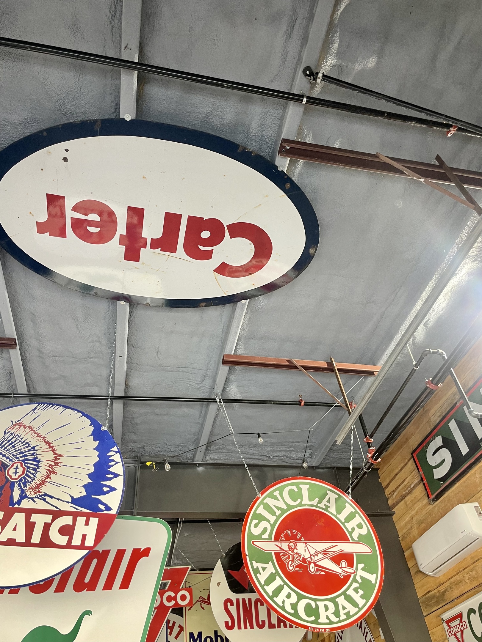 We still have a few areas without signs where the big garage doors roll up and thought we could hang a couple of Carter signs to fill in the empty space. These signs are very thick and heavy so it was no easy task bolting them up without drilling new holes in the signs.