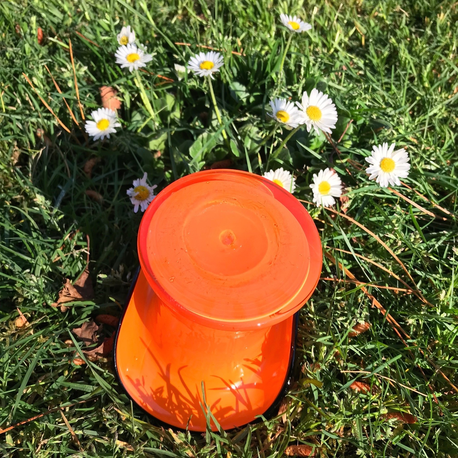 Anyway, this one is bright orange, with a black crest. It measures 9.5 cm tall, 10.5 cm across the top rim, & 7.3 cm across the base, which has a neatly polished out pontil mark.