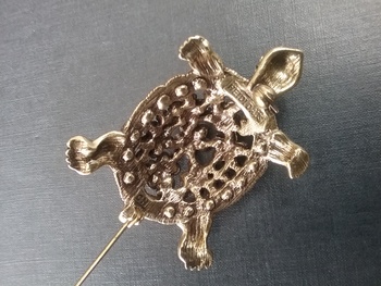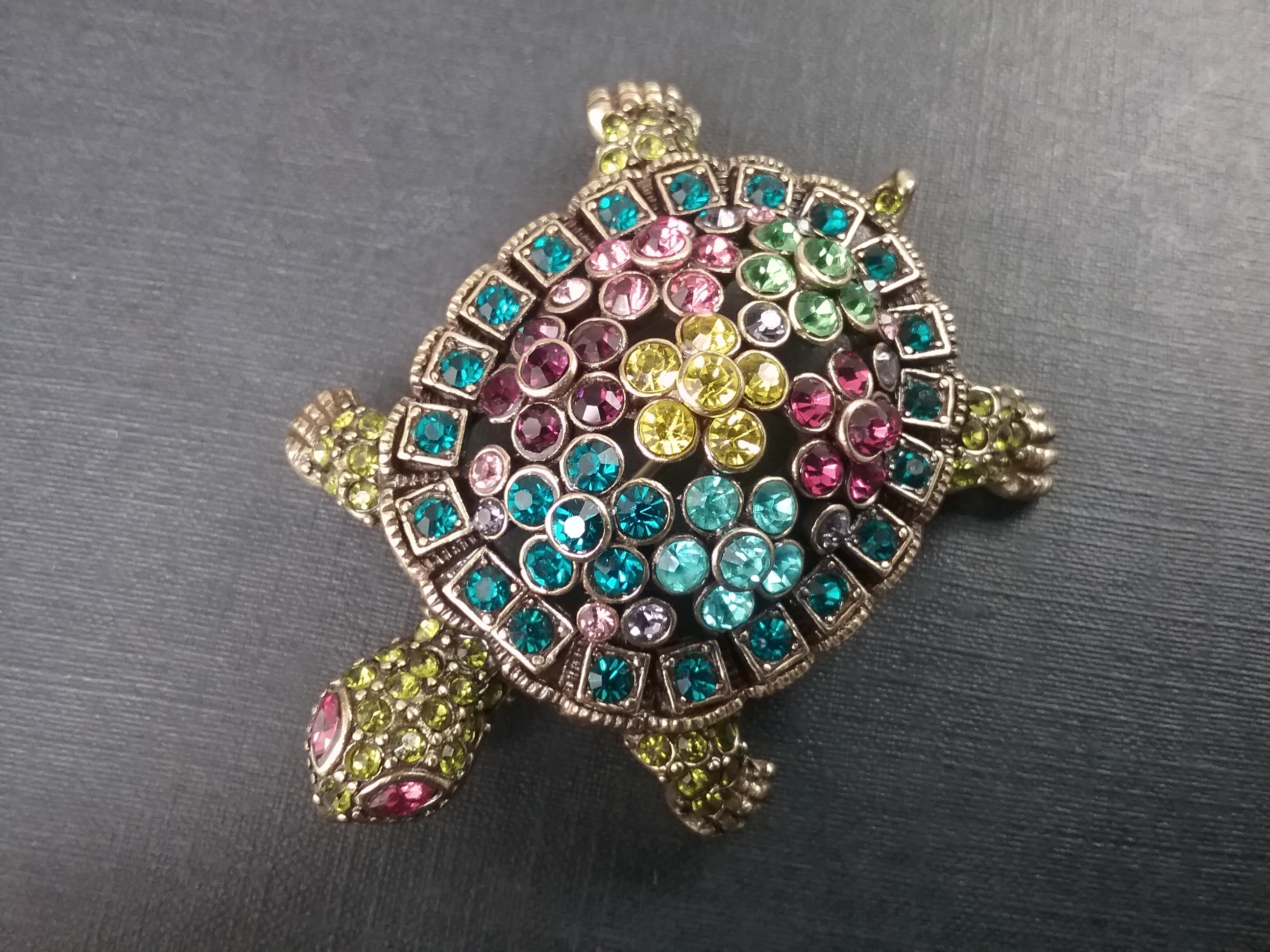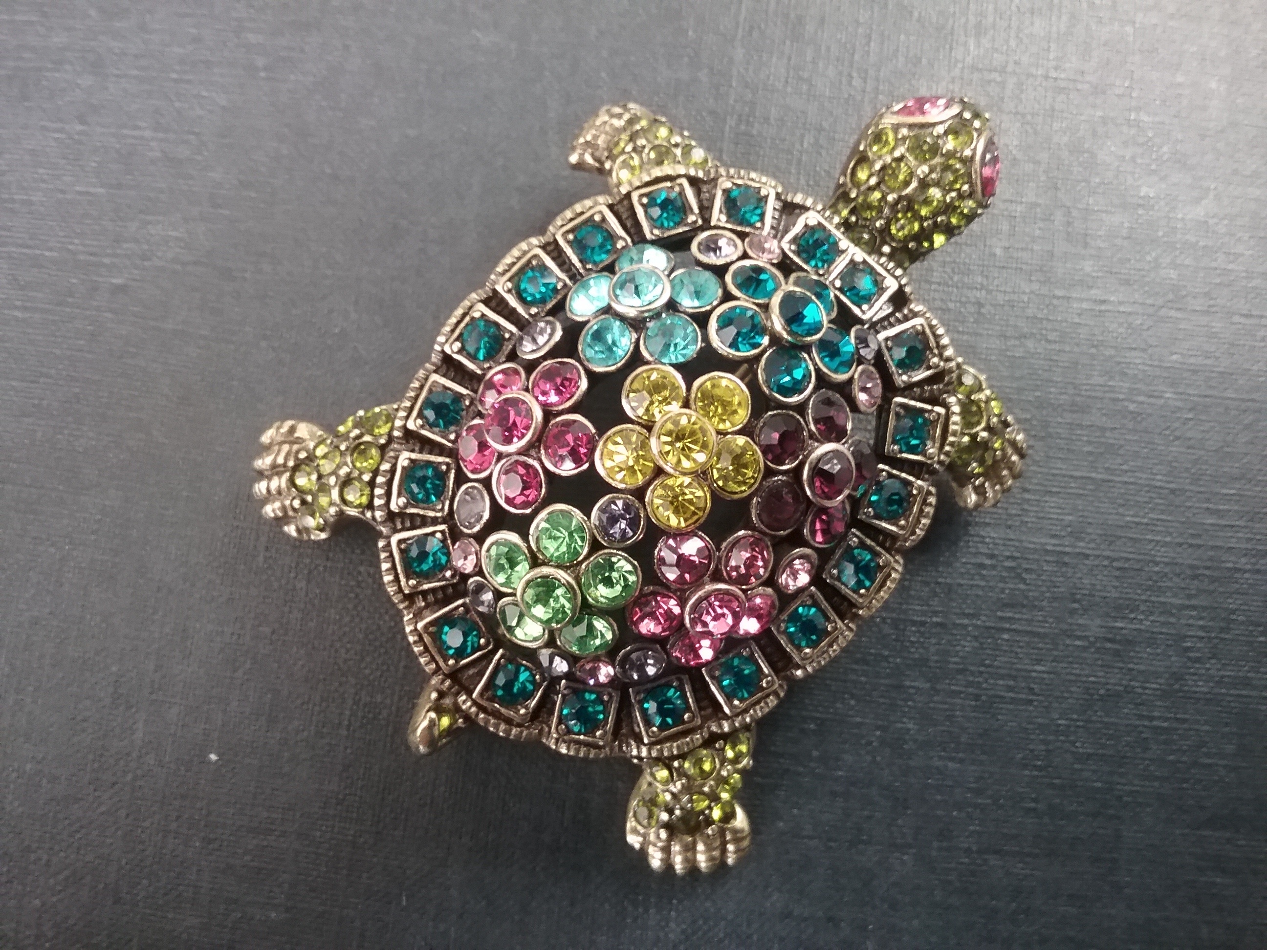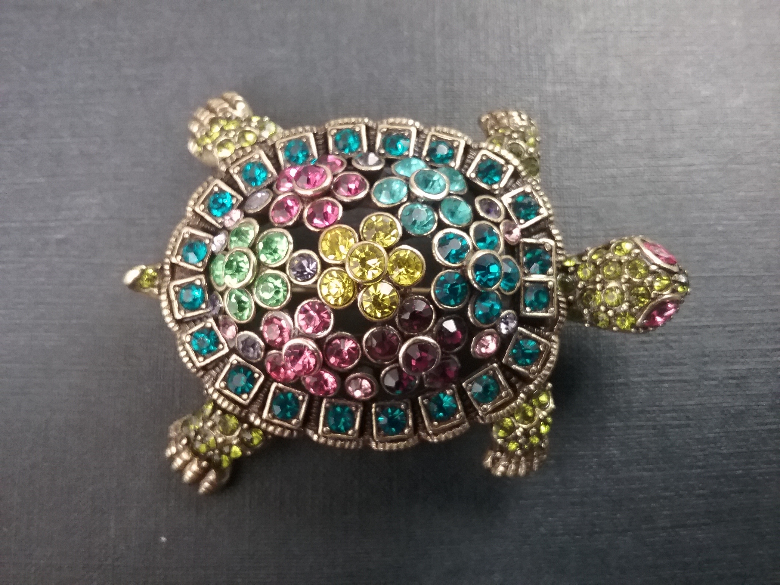 Scott the myriad of colorful rhinestones on this turtle drew me to it, I'm particularly a fan of the teal shell border (teal is like blue zircon which is my December birthstone), and the way the jeweler used olive green stones as the appendages. A wonderful creation by Heidi Daus, only the 2nd piece I have by her