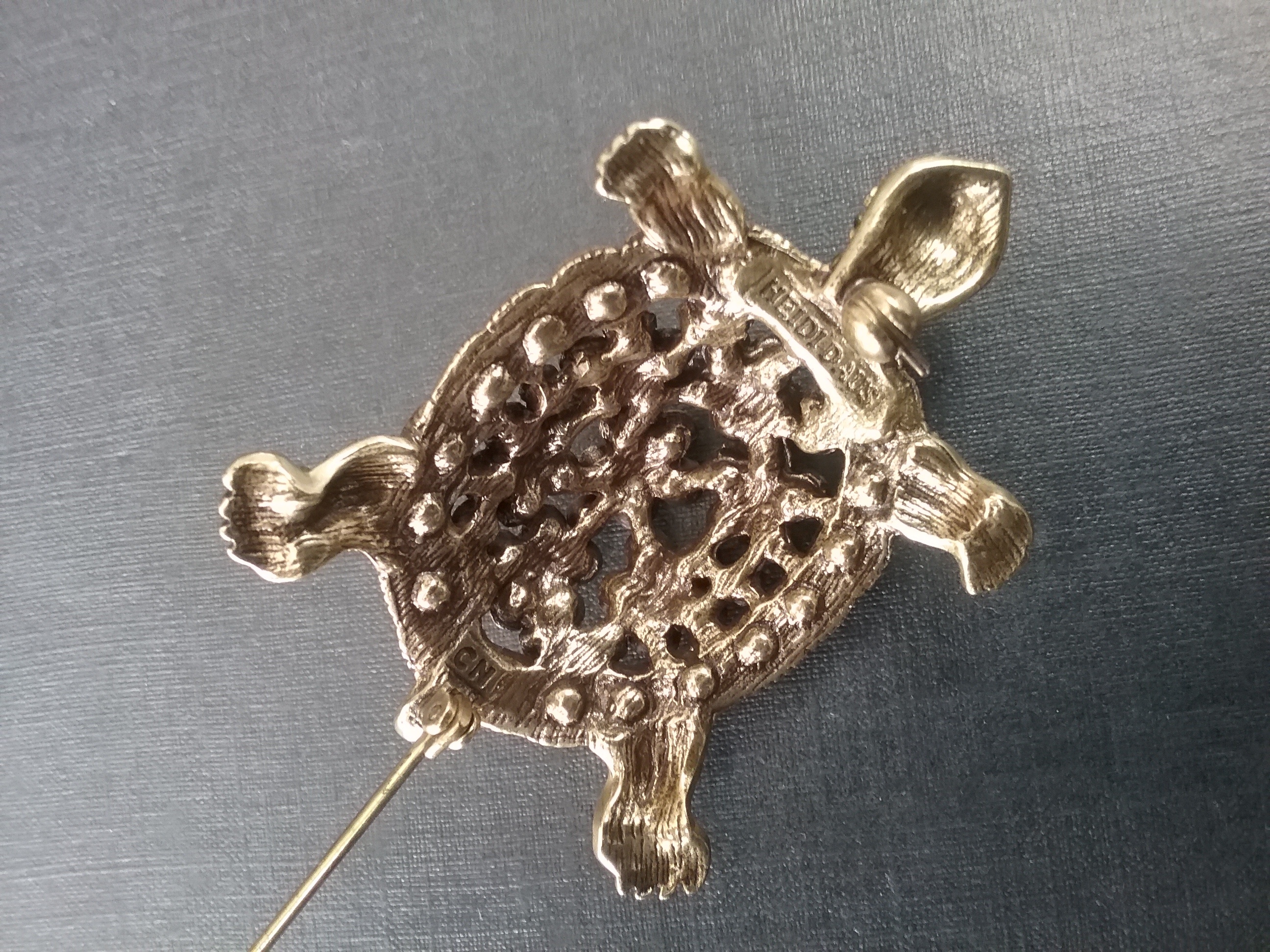 This 2"W antiqued goldtone turtle brooch has assorted brightly colored rhinestones in a floral back design, signed Heidi Daus on the back