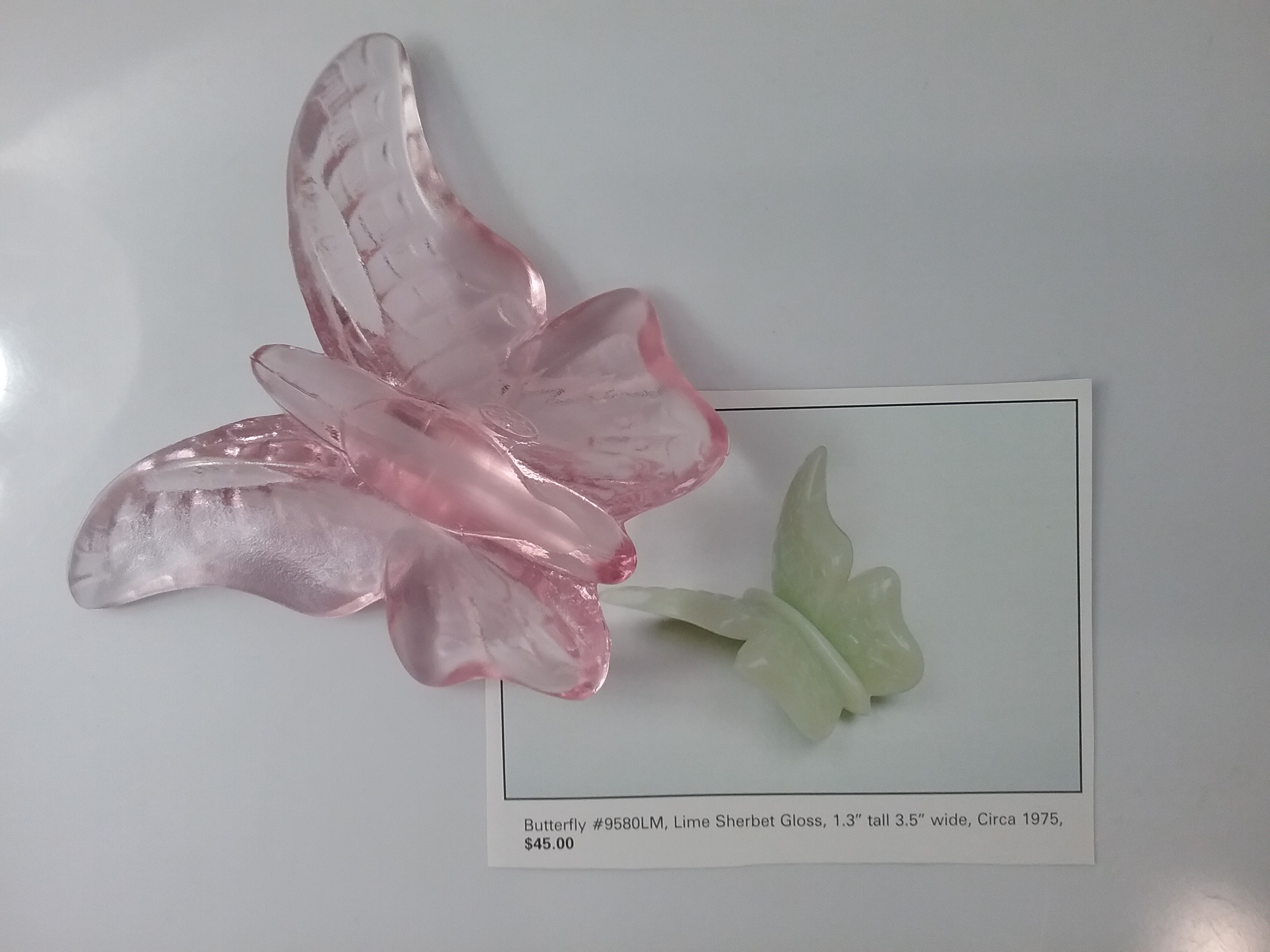 Here is a 3 1-2"W textured pink glass butterfly which was the first butterfly design from Fenton Glass ca mid-1970s, as seen in lime sherbet in photo #4 taken from book Glass Animals and Figurines by Coe. Fenton raised oval logo can be seen in last photo, under top wing