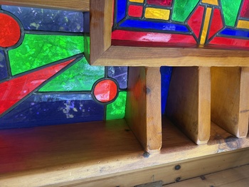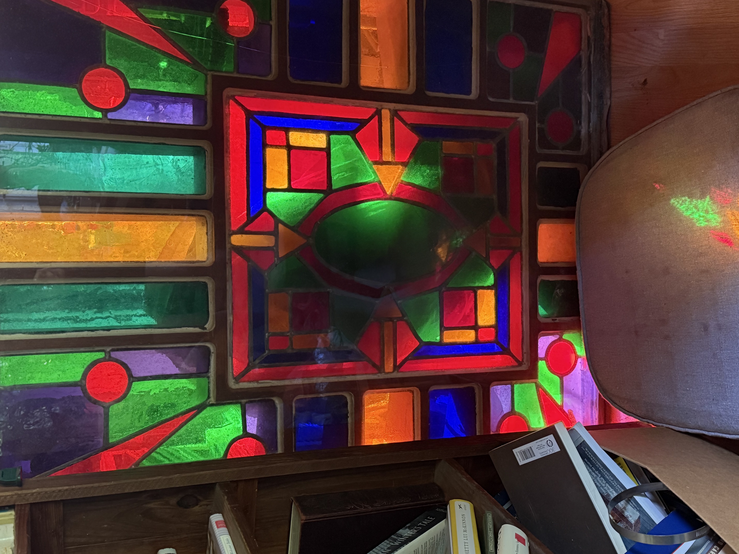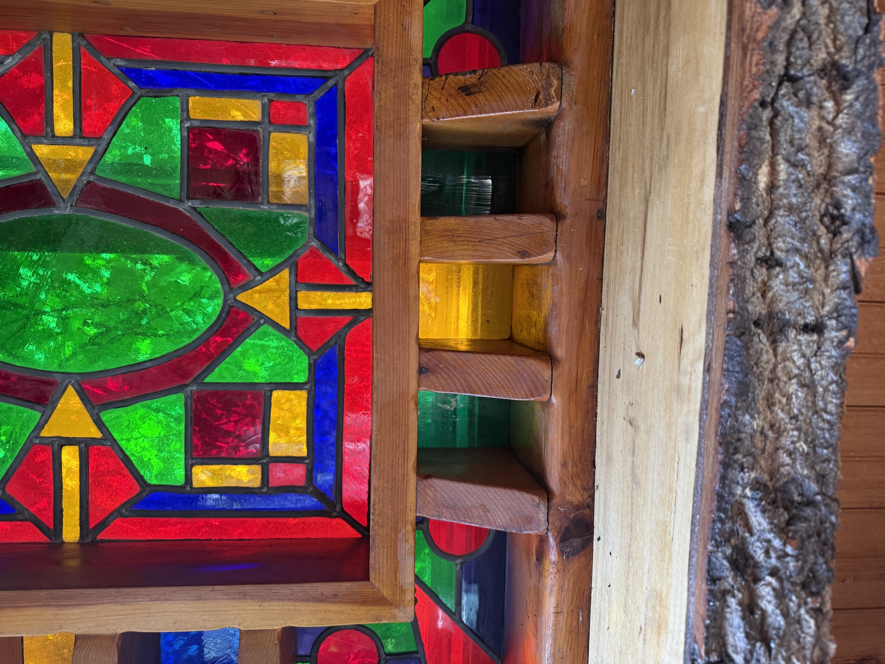 A guy inherited his grandmother's home and his wife hated this piece! 40" wide, 49" high, about 100lbs... the stained glass is built into the strange wood frame. Clearly a custom piece. Curious to find out about the pattern, possible age and creator... in a Scarborough Maine house