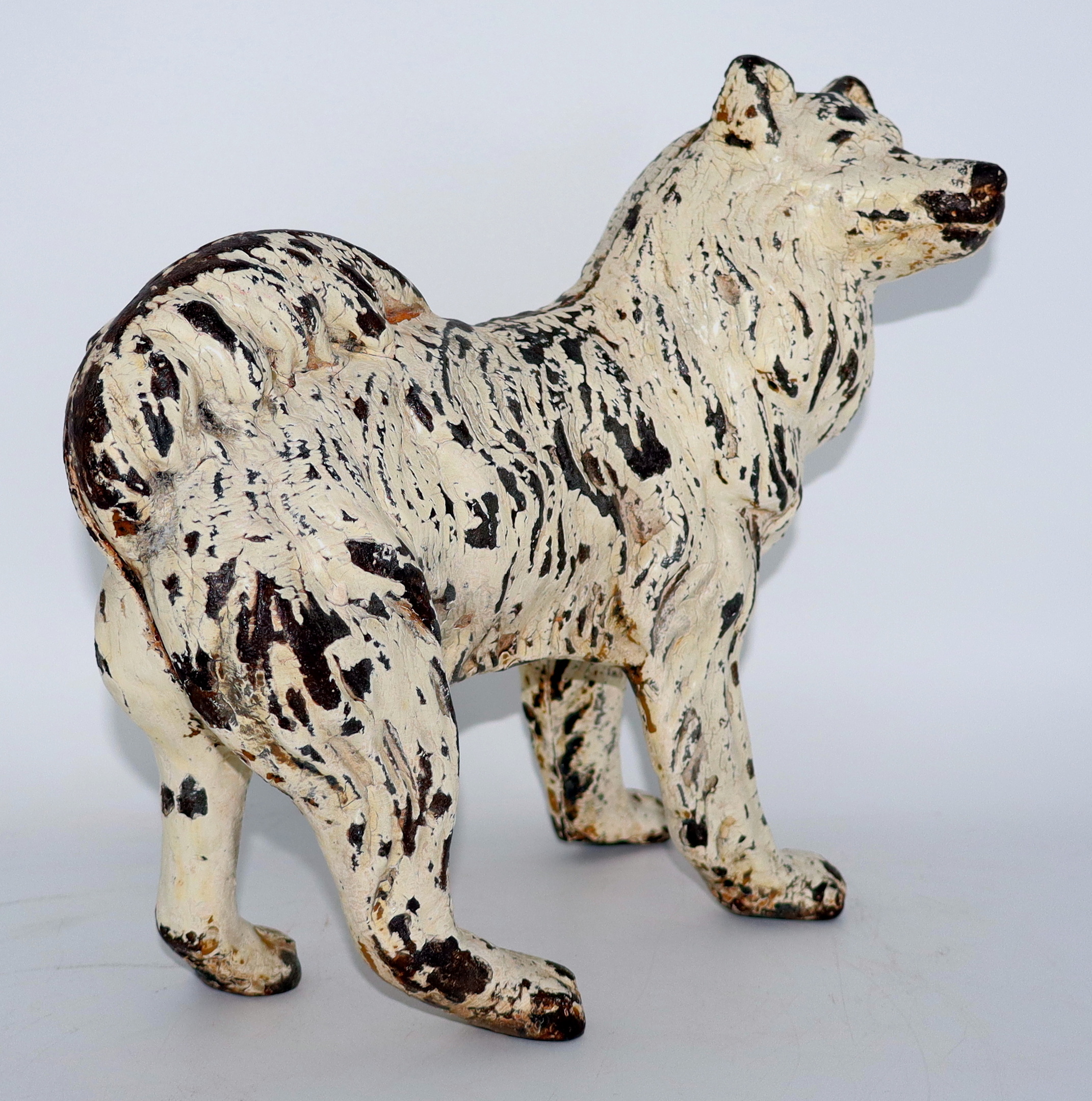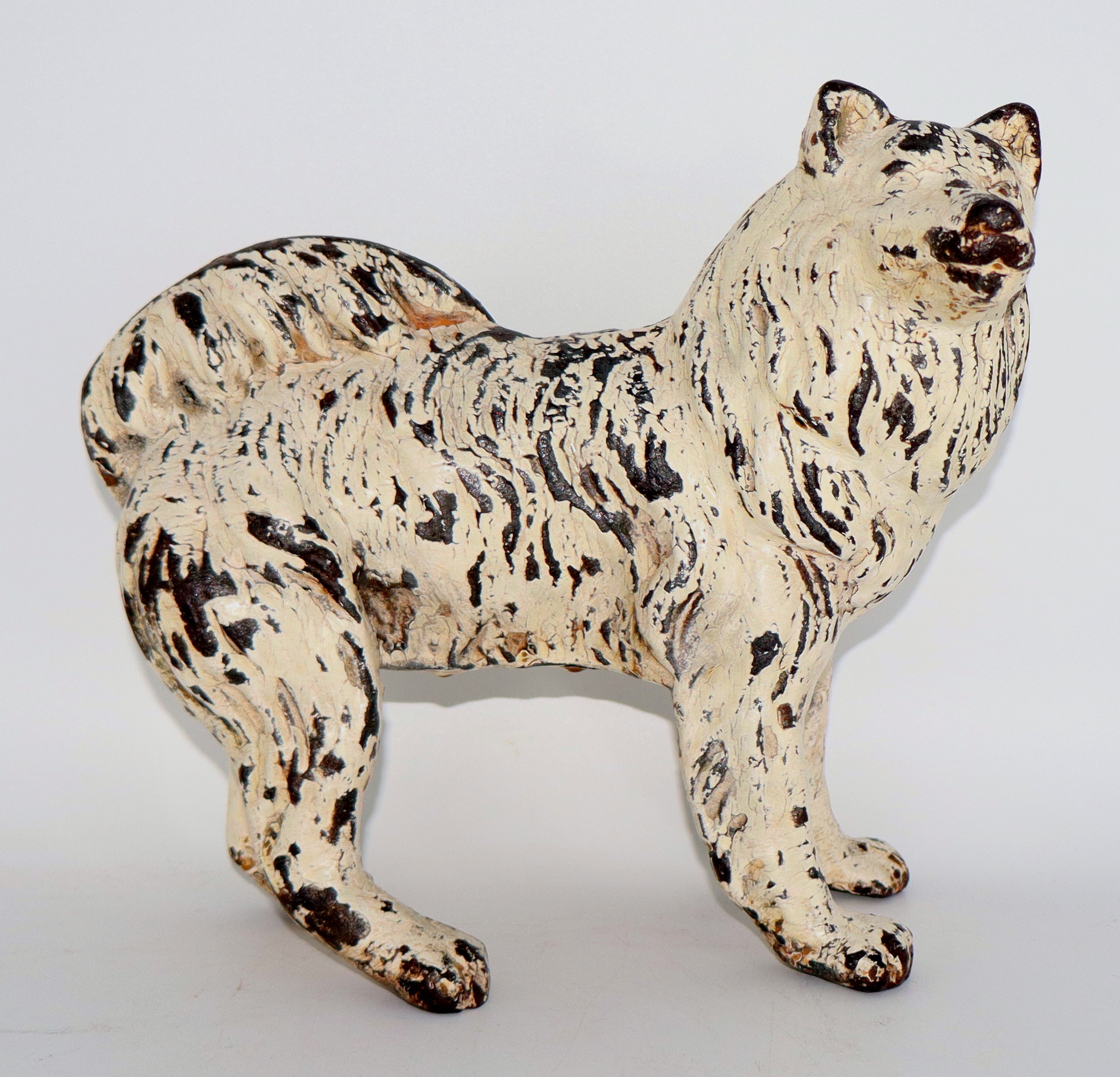 When I took ownership of this one, it had a thick coat of black paint and a coat of tan paint under the black (shown in pic #4). I was able to carefully remove the two top coats of paint to expose the original white polychrome paint. This one measures 9" long, 8 1/2" tall and weighs 8lbs 6oz.