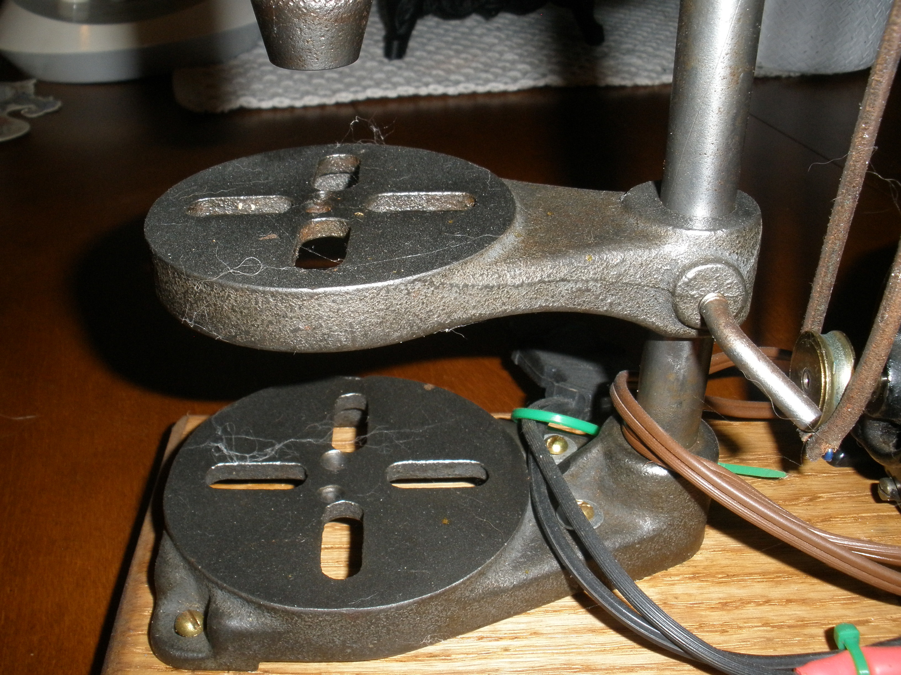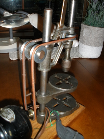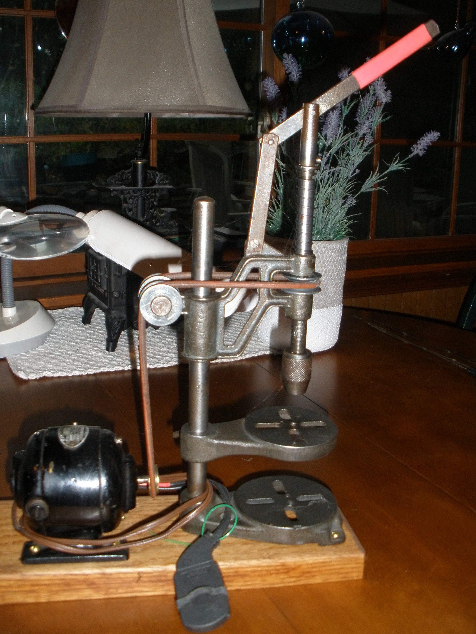 miniature version of an antique belt driven drill press.