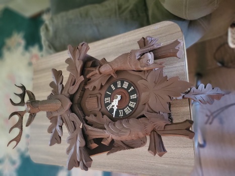 I recently obtained a cuckoo clock that had an unknown provenance and was not only damaged, but missing wood parts. All the carved parts are wood, the bird, and even the stag’s antlers. There is what I assume is a pheasant carving on one side and a hare on the other. I’m not a collector - I merely wanted an operating cuckoo clock. I disassembled, cleaned, and oiled the movement. The movement is stamped with Made in Germany - US Zone. I repaired the wood parts with pieces of another clock I got on ebay and assembled the clock. It wont keep running. The weights I got with the clock weigh 425 grams, but I’m not sure they belong to this clock.