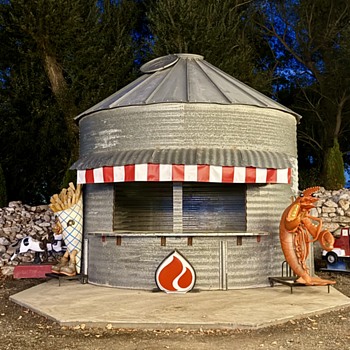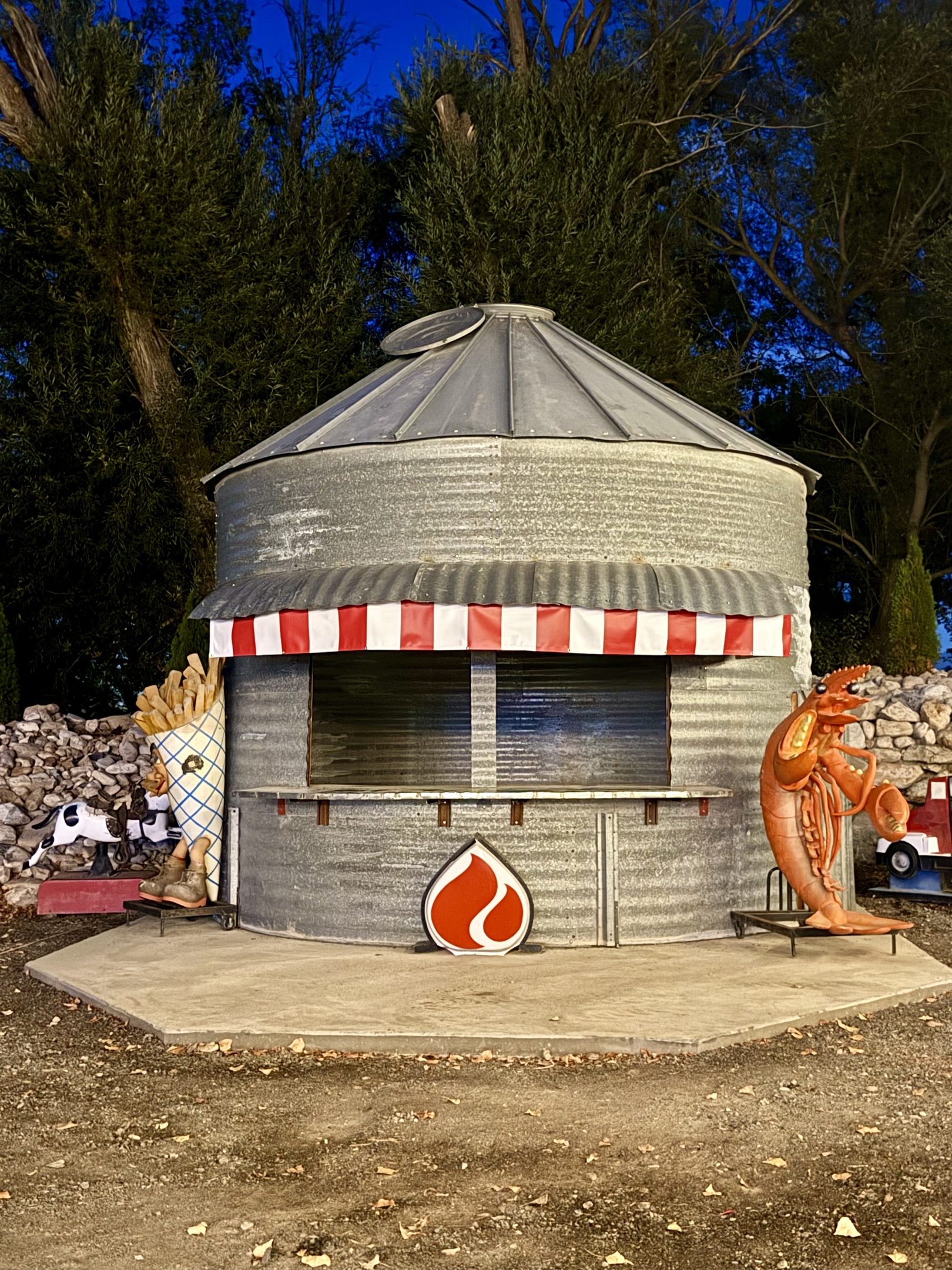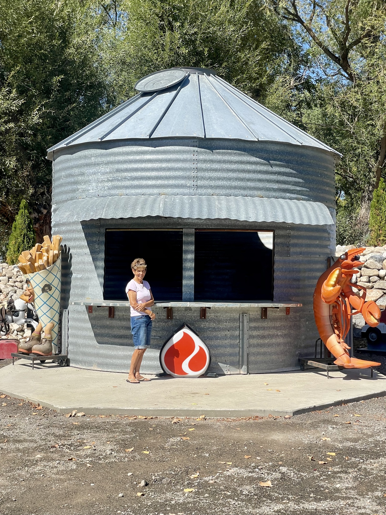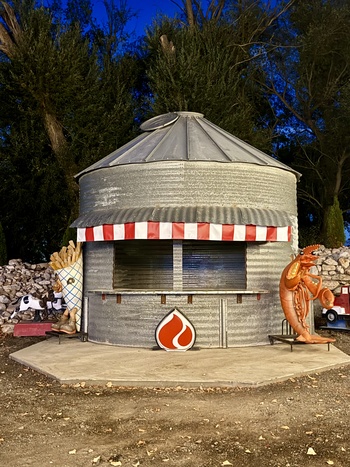 We thought a grain bin in back of the Sparks Museum that sells ice cream, candy and pop, might be a good idea on hot Summer or even Fall days. Still working on the details but it’s coming along. Gotta love the new red and white valance we just added