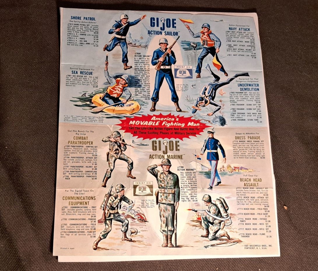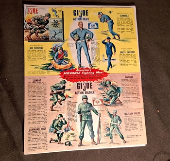 I have here two pieces of double sided paperwork that came with GI Joes and equipment sets. The first one shows all the equipment sets that were available in 1964. There were a few more a few more sets available in 1965..