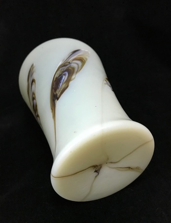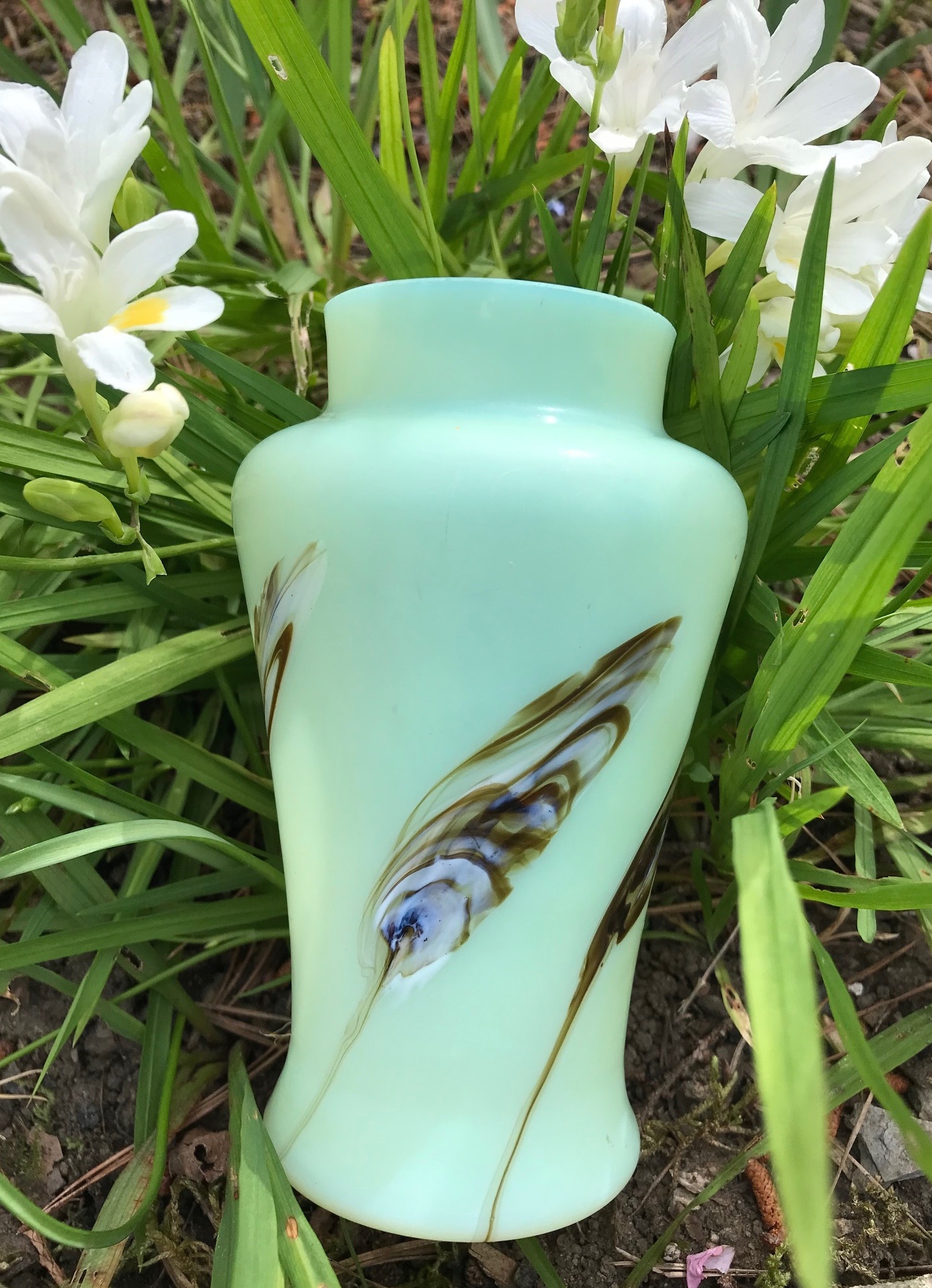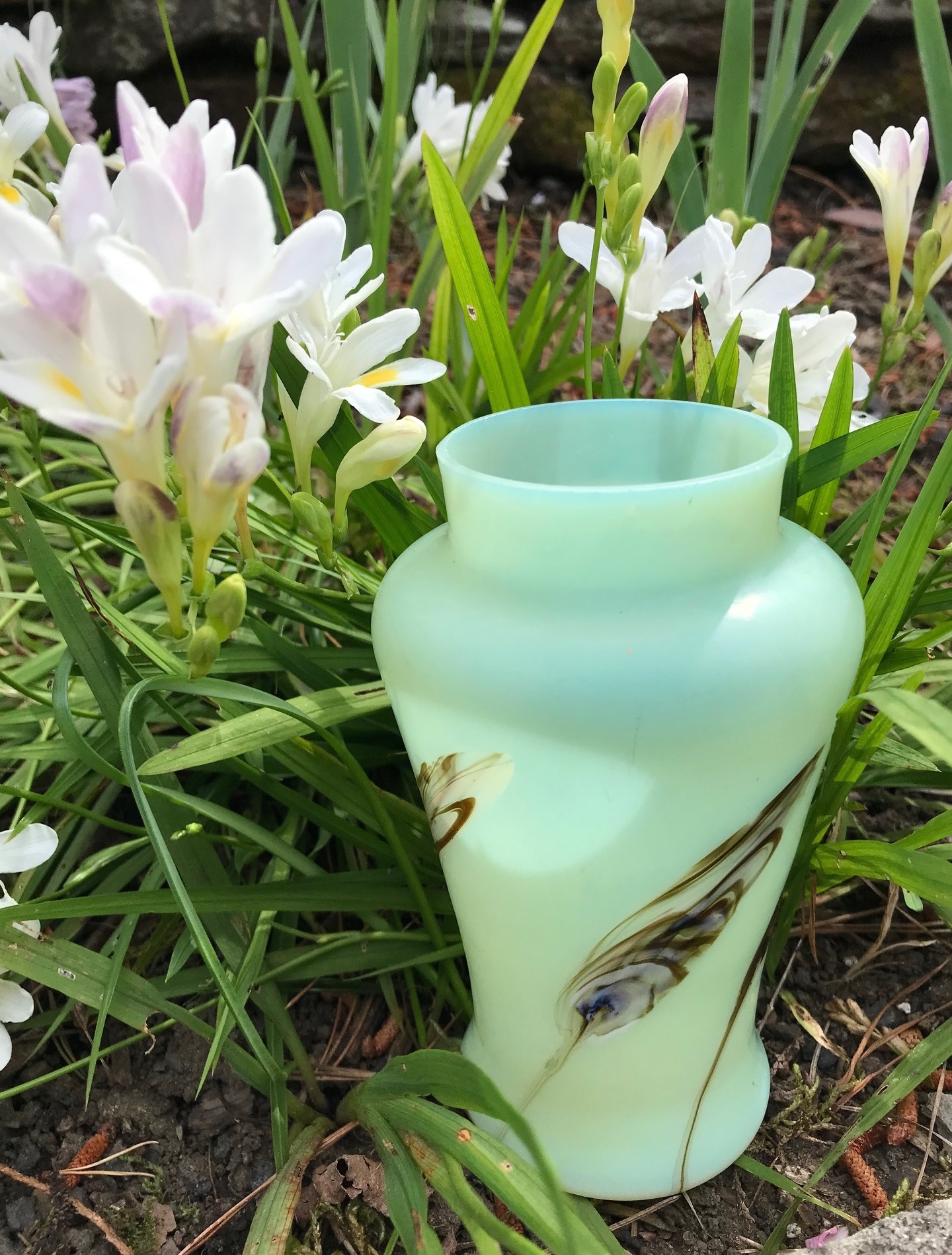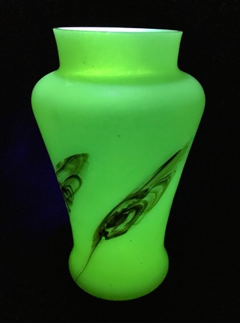 This stunning vase is made from a pale custard opaline glass with a uranium content & satin finish. As can be seen, the colour varies a lot between indoor & outdoor light.