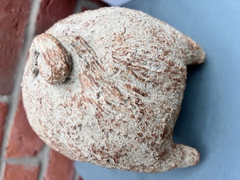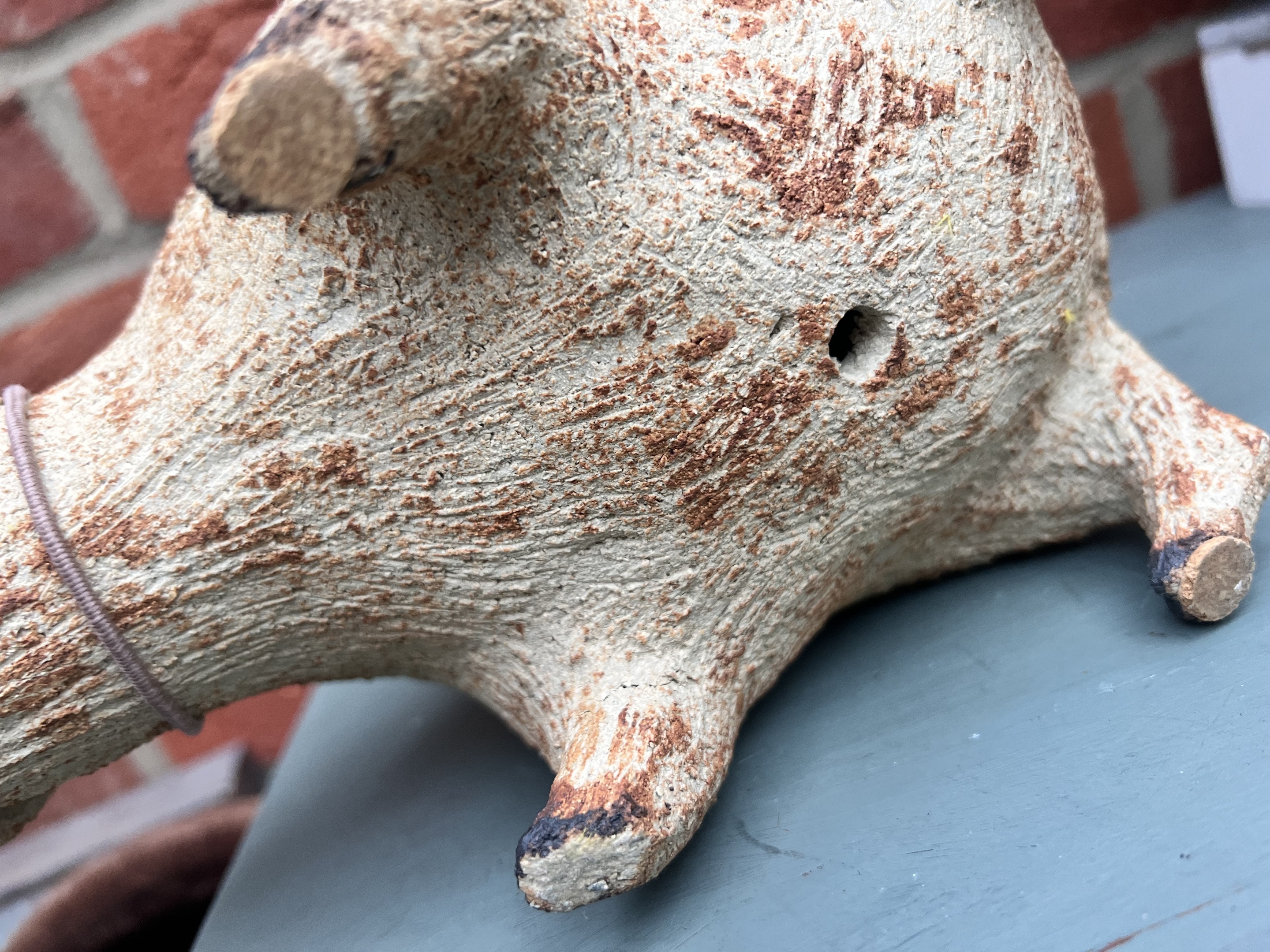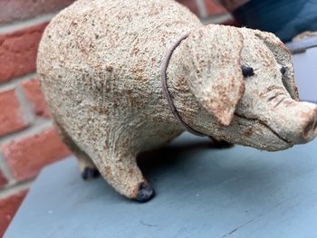 It's a really cute pig. It appears to be made of cement, based on the brainy texture. I too can find nothing about this one.