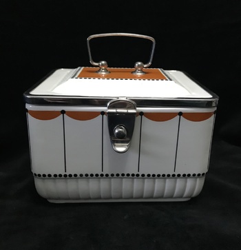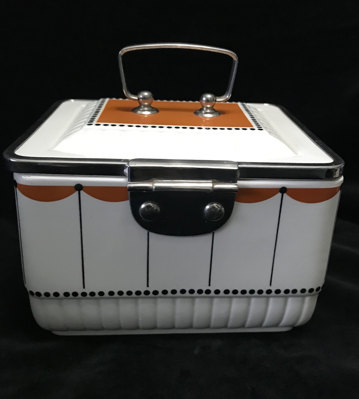 White with orange & black details, it features metal fittings & is in absolutely mint condition. Amazing to think it is 100 years old!